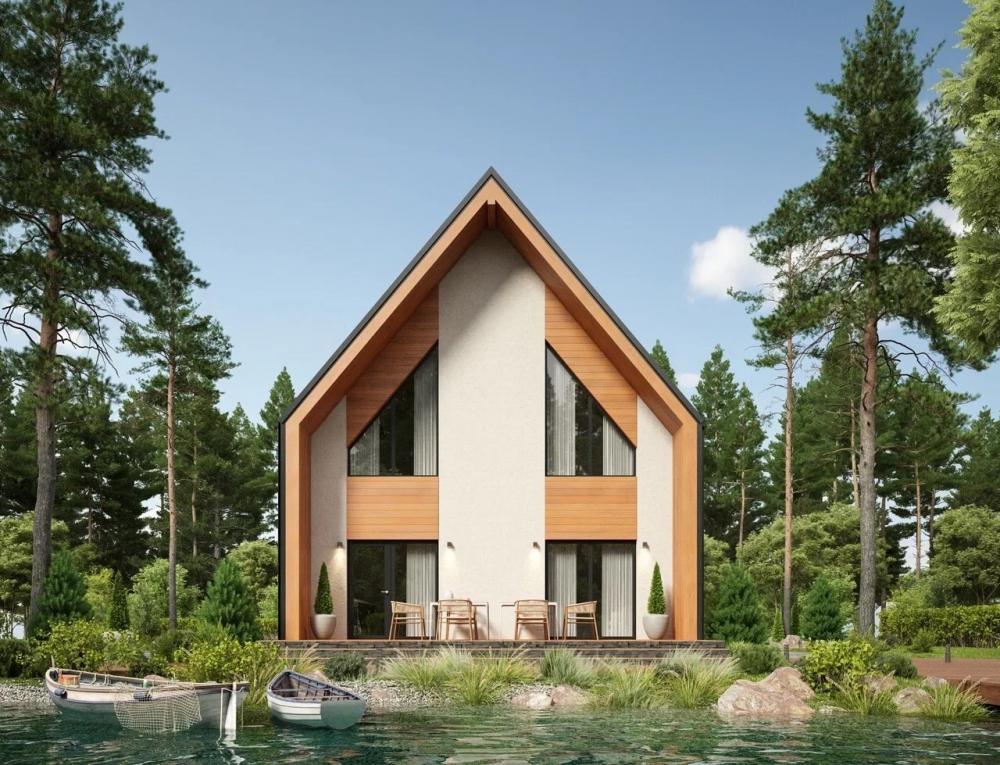 Проект дома в стиле барнхаус. Отличный вариант для молодой семьи из 2-4 человек, для любителей лаконичных решений. Подойдёт для дачного, небольшого городского участка, пригоден для круглогодичного проживания. На первом этаже просторная кухня-гостиная с панорамным остеклением и выходом на террасу, котельная и гардеробная. Наверху расположены 2 спальни, большая ванная и вторая гардеробная. Окна второго этажа повторяют линию крыши, улучшают освещение помещений, украшают фасады.