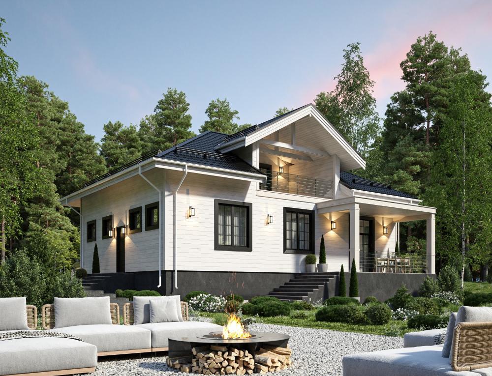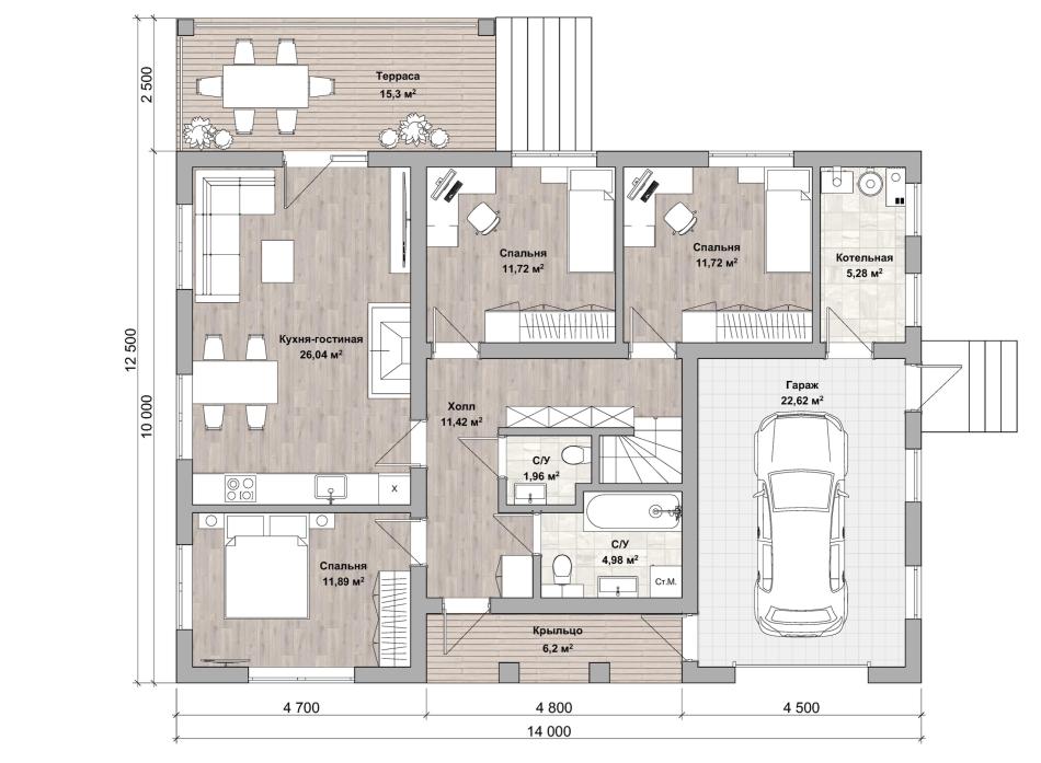 Проект одноэтажного дома с гаражом для семьи из 3-5 человек. Его особенность – удачное использование пространства под крышей. Там устроена вторая гостиная с большой лоджией. Её же можно использовать как гостевую комнату, кабинет или библиотеку. Справа и слева закрытые бытовые помещения. Внизу расположились 3 спальни, кухня-гостиная с камином и выходом на крытую террасу. 2 санузла и котельная обеспечивают в здании комфорт круглый год. Проект подойдёт для городского участка, дачи, загородного дома.