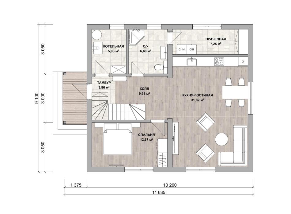 - Габаритные размеры дома 10,26 м х 9,1 м