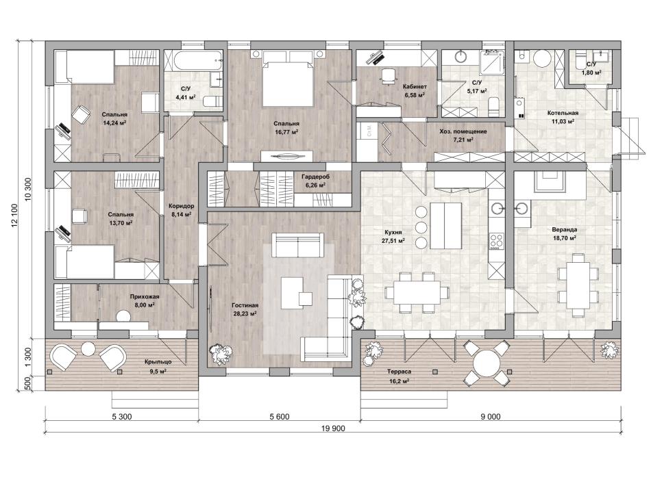 - Габаритные размеры дома 10,3 м х 19,9 м