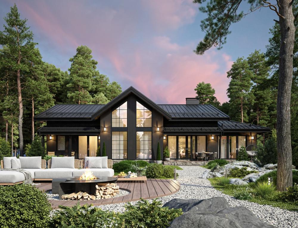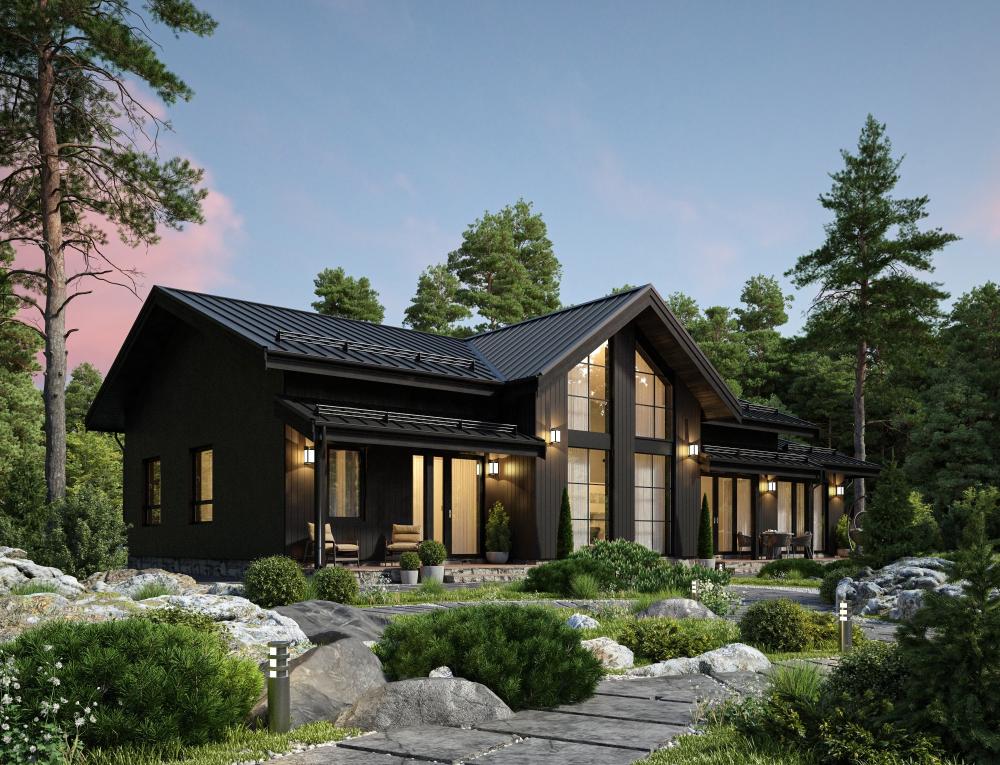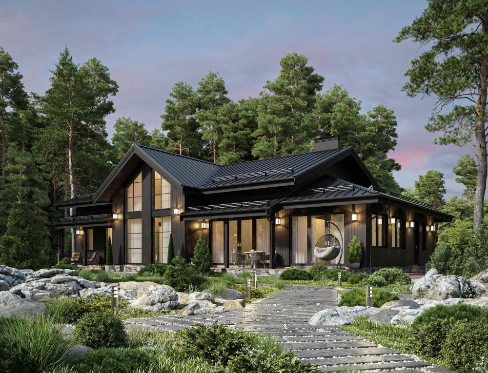 Проект одноэтажного статусного дома для семьи из 3-4 человек. Потребует большого и/или видового участка, там будет выглядеть особенно выигрышно. Небольшая терраса у входа, прихожая с гардеробной. Слева 2 спальни. Далее санузел, хозяйская спальня с выходом в кабинет и собственную ванную, котельная с санузлом и тёплая веранда. Центральную часть здания занимают гостиная и столовая-кухня. К столовой и веранде примыкает небольшая терраса. За счёт панорамного остекления и конструкции кровли дом выглядит легко и солидно одновременно. Высокие потолки делают помещения визуально просторнее