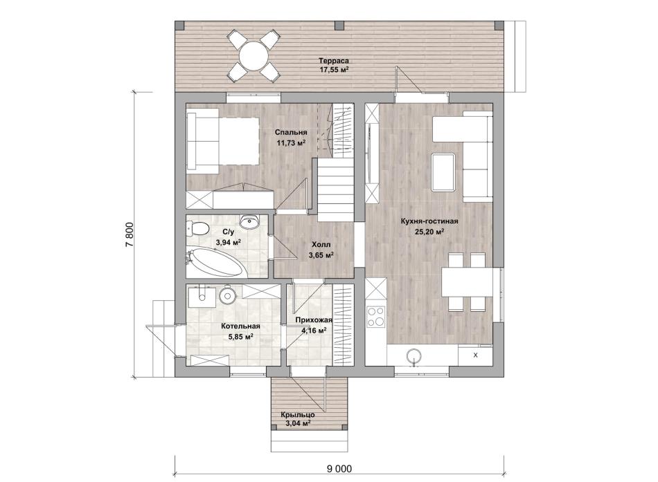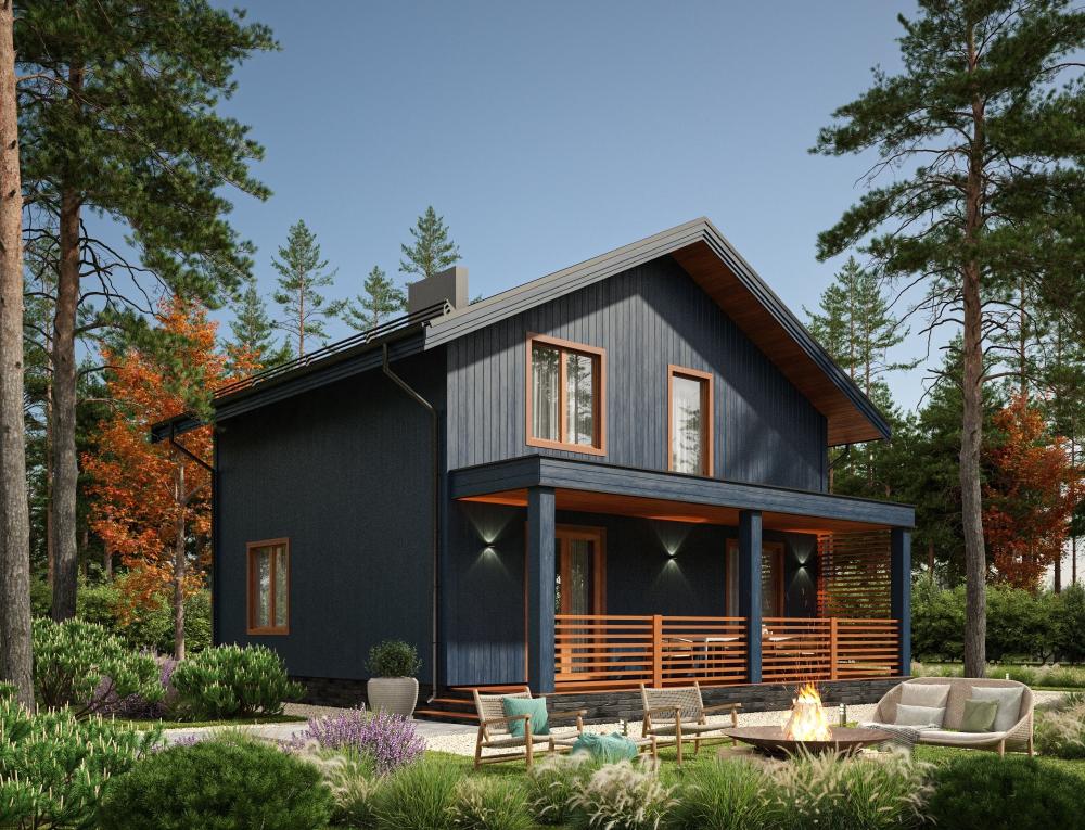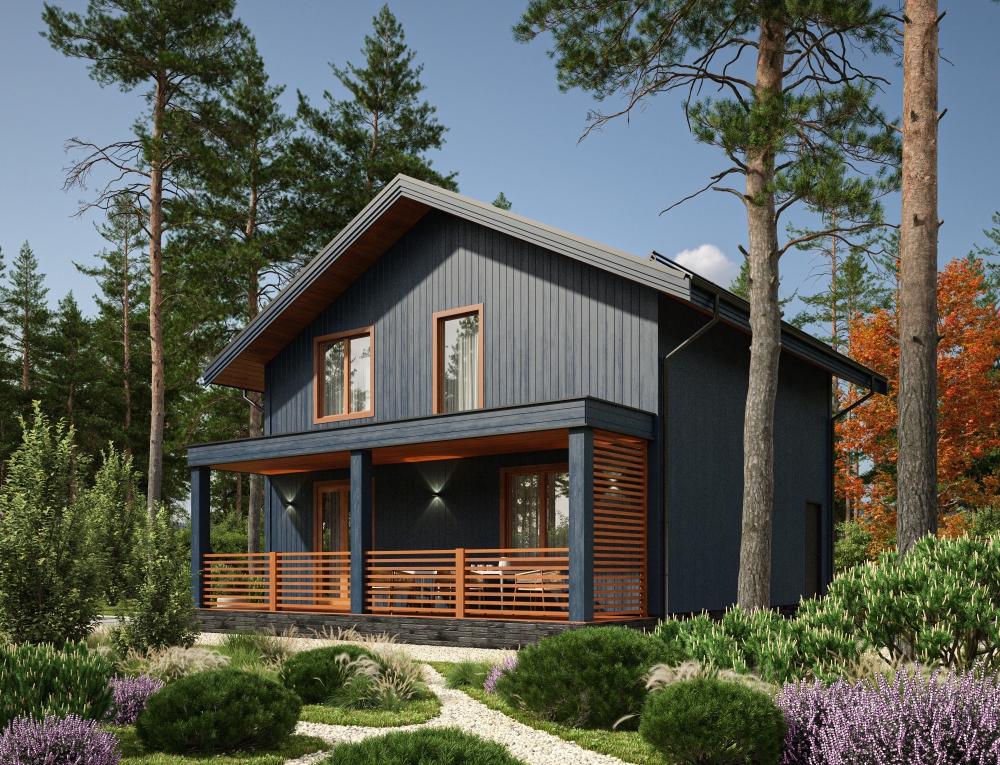 Проект двухэтажного дома для семьи из 4-6 человек. Рассчитан на круглогодичное проживание. Небольшое здание с классической планировкой. Большую часть первого этажа занимает гостиная-кухня с выходом на крытую террасу. Здесь же гостевая спальня, ванная и котельная с запасным выходом. На втором этаже разместились 3 спальни, гардеробная и вторая ванная. Всё чётко, эргономично, но с полным набором удобств для любимой семьи.