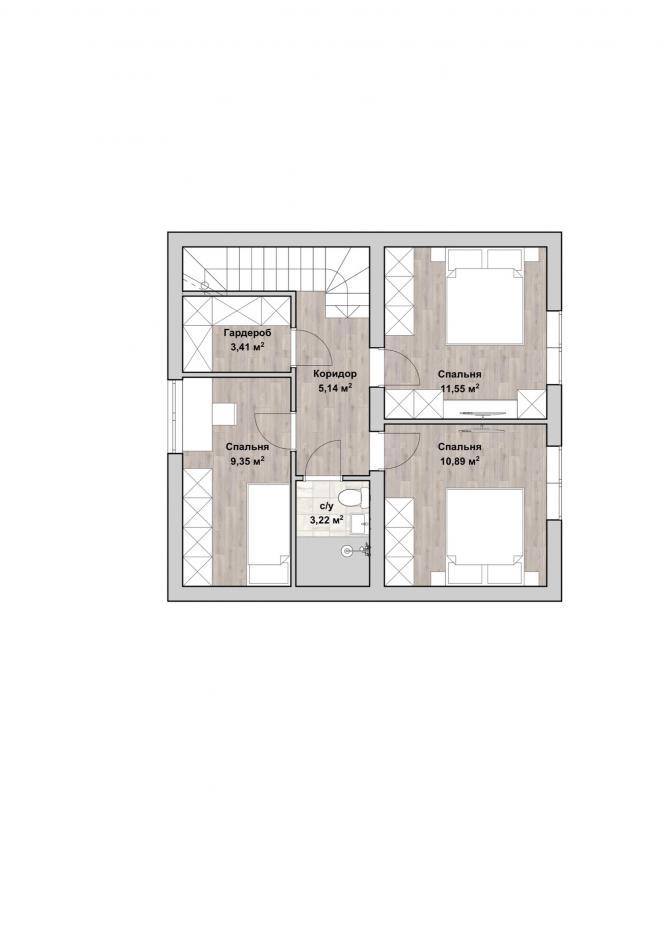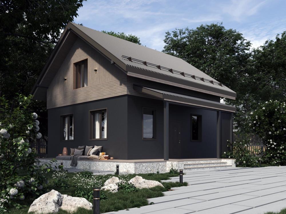 Проект небольшого бюджетного дома с мансардой. Здание хорошо впишется в любой участок земли благодаря своей компактности. Навес и тамбур необходимы, чтобы в доме сохранялись тепло и уют. Гостиная встречает своей парадной частью, от входа не сразу заметна кухня, утопленная в нишу. Свет в помещение попадает через 3 окна с двух сторон, что делает его визуально больше. Лестница наверх органично вписана в пространство и почти не занимает места. Справа от входа находятся котельная, ванная и гостевая спальня. В мансарде разместились 3 жилые комнаты, гардеробная и санузел. Дом подойдем семье из 4-6 человек для постоянного проживания или в качестве дачи.
