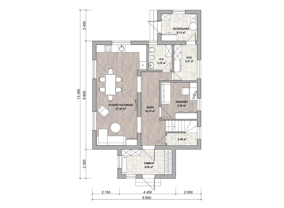 - Габаритные размеры дома 8,6 м х 8,6 м