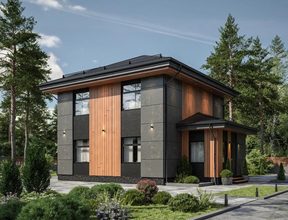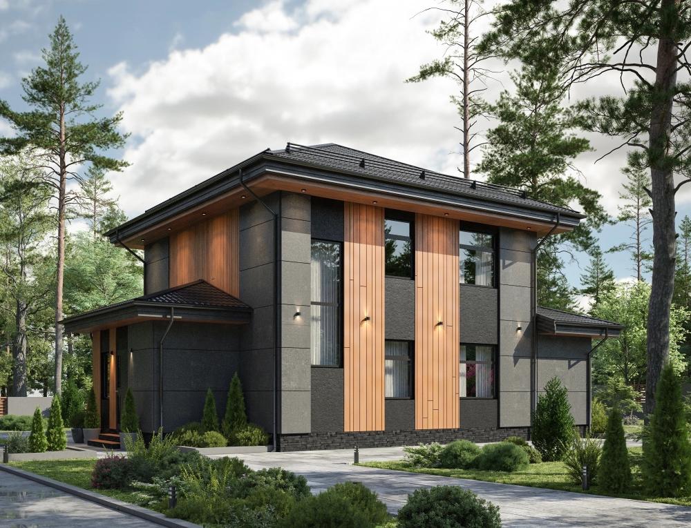 Подойдёт для круглогодичного проживания семьи из 4-6 человек. Проект двухэтажного дома, где тамбур и котельная не отнимают ни метра жилой площади. Во внешней отделке предусмотрена эффектная подсветка. Гостиная совмещена с кухней, но в зонах отдыха и приготовления пищи свои входы. На первом этаже расположены кабинет, санузел и хозяйственное помещение с выходом в котельную и во двор. Лестница с высоким окном ведёт на второй этаж. Там находятся 3 спальни, одна из которых с большой гардеробной. Второй санузел около спален – забота о домашних.