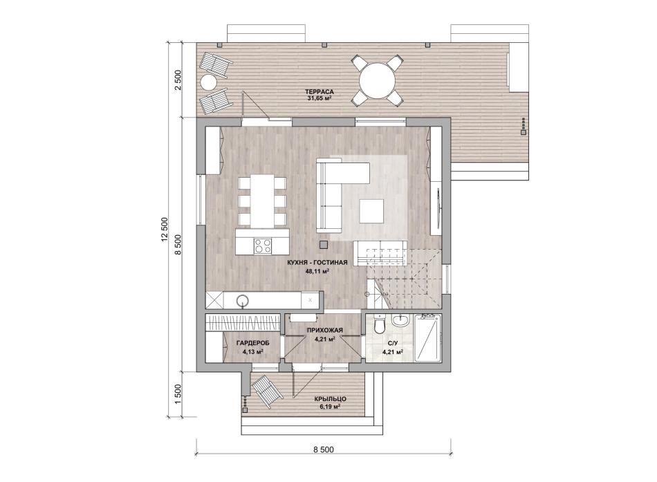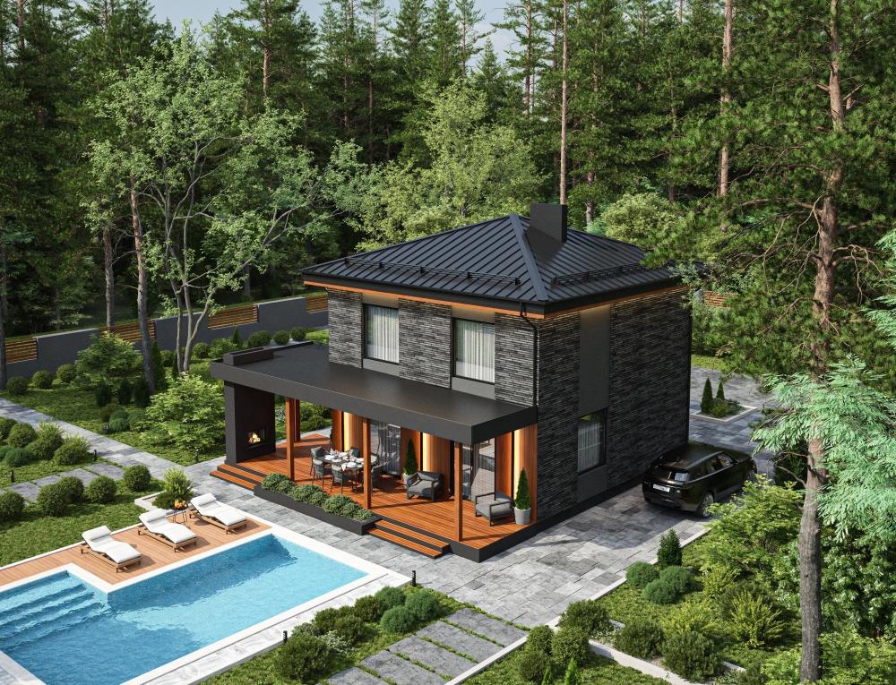 Проект совмещает в себе самые заветные желания заказчиков. При своих скромных размерах он производит солидное впечатление на окружающих. Подойдёт гостеприимной семье из 4-5 человек. Почти весь первый этаж занимает гостиная. На 50 м² расположится мягкая мебель, домашний кинотеатр, ещё останется место для танцев. Здесь же устроена кухня и столовая зона. Панорамные окна наполняют комнату светом и воздухом, делают визуально ещё больше. К гостиной примыкает просторная крытая терраса. На втором этаже всё для полноценного отдыха: 3 спальни и вторая ванная.