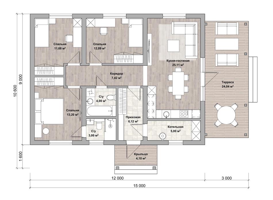 Проект для тех, кто решил построить одноэтажный дом. Подойдёт для постоянного проживания семьи из 4-5 человек. Годится в качестве дачного варианта тем, кому важен комфорт везде. Предусмотрены 3 спальни, 2 санузла, котельная, прихожая. Гостиная совмещена с кухней, украшена панорамными окнами. Здесь можно выйти на террасу под навесом, провести на свежем воздухе незабываемые часы.