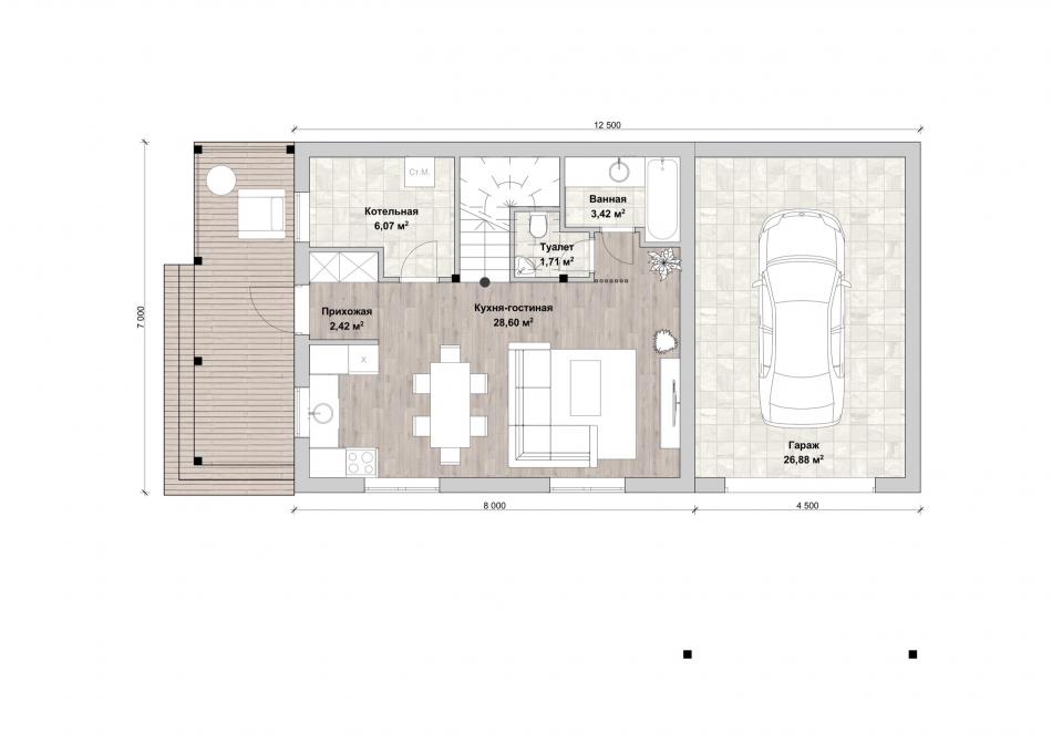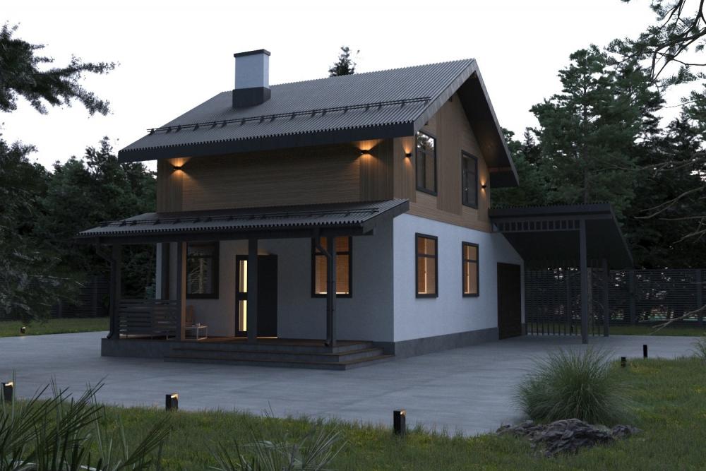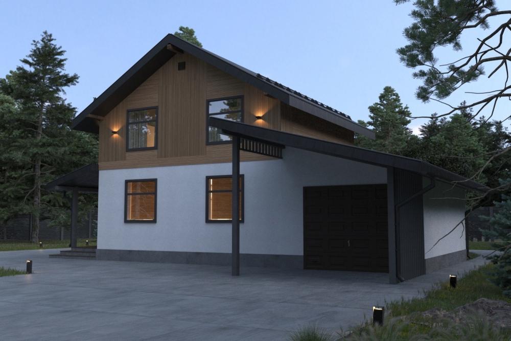Бюджетный, уютный дом с гаражом и двумя террасами. Подойдёт для постоянного проживания молодой семьи или для дачи. Крытая терраса закрывает вход от осадков. Через небольшую прихожую попадаем в кухню-гостиную с видом на парадный въезд и террасу. Слева от входа котельная, лестница наверх, раздельные санузлы. На втором этаже расположены три небольшие спальни. Одна из них с гардеробной. По желанию эта комната с окном может использоваться как кабинет, игровая, мастерская. За домом спрятана терраса с небольшим навесом и камином – отличное место для досуга.