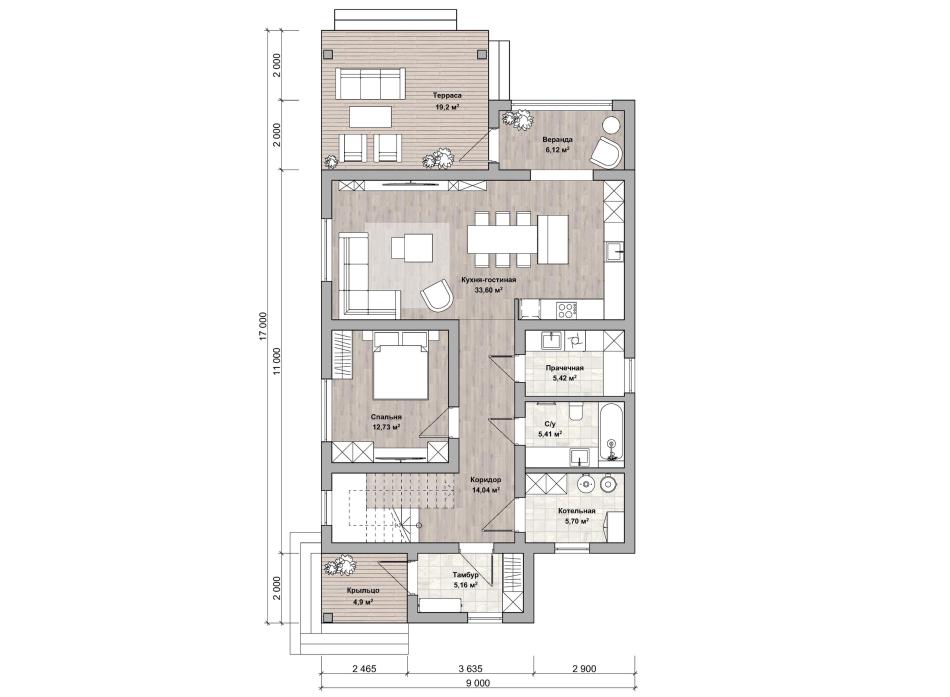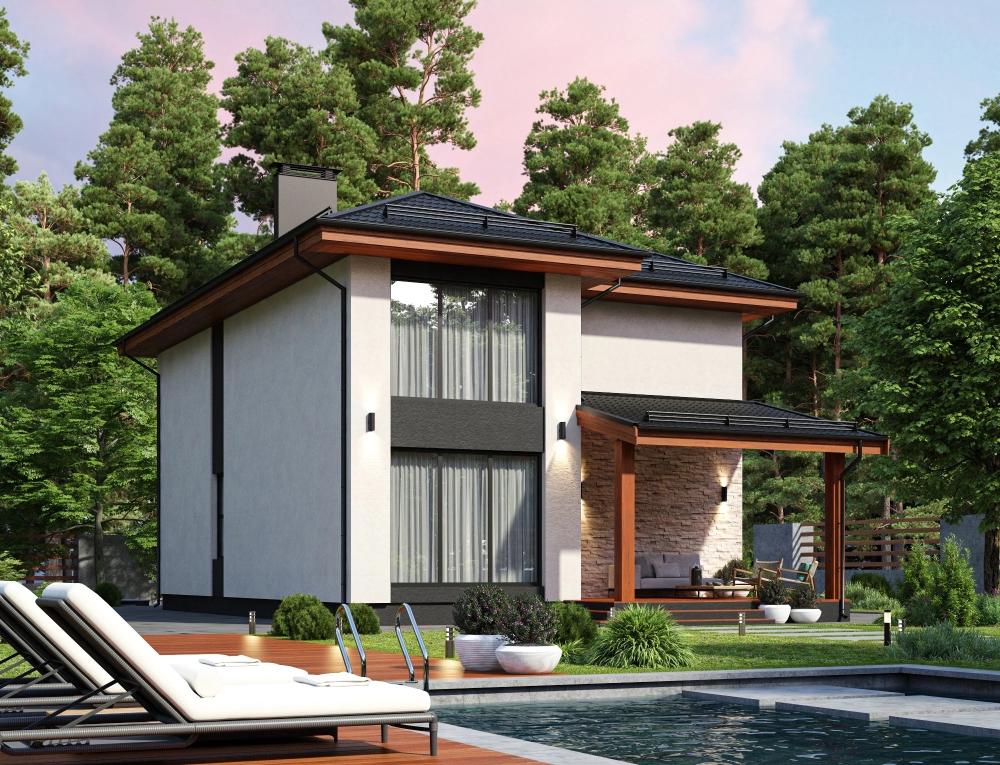 Проект двухэтажного дома. Рассчитан на круглогодичное проживание семьи из 4-6 человек. Фасад с улицы с навесом над входом и выступающим тёплым тамбуром. Сторона, выходящая во двор, оборудована крытой террасой, панорамными окнами. На первом этаже большая гостиная-кухня. Из неё можно пройти на веранду, далее на террасу и в сад. Слева от входа одна из спален. Справа – прачечная, санузел и котельная. Наверху 3 спальни, одна из них с выходом в лоджии, там панорамный вид на окрестности. Рядом просторная ванная комната и гардеробная с окном. Система окон обеспечит освещение холла, лестницы, вид на дорожку к дому. Такой дом будет гармонично смотреться и на городском участке, и на загородном.