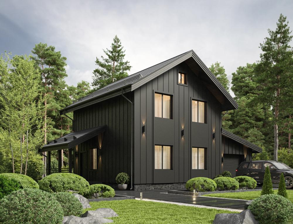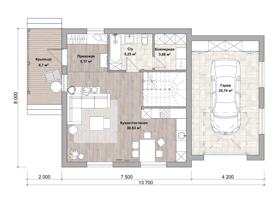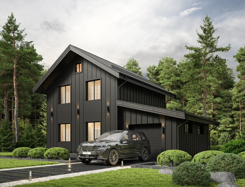 Бюджетный дом с гаражом. Подойдёт для небольшой семьи из 3-4 человек. Благодаря сдержанной внешней отделке впишется в городской квартал, улицу коттеджного поселка. Может использоваться как дачный и гостевой дом. Классическая планировка. Внизу прихожая, гостиная с кухней в нише, ванная и бойлерная. Лестница соединяет открытую зону и приватный мир.