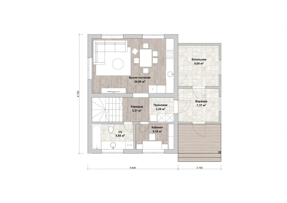 - Габаритные размеры дома 8,7 м х 6,6 м