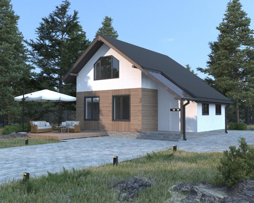 Компактный двухэтажный дом для круглогодичного проживания семьи из 3-4 человек. Такой удачно впишется и в городской участок, и в загородный. Необычный прозрачный навес защищает вход от осадков. Веранда играет роль тамбура, здесь же двери в котельную. В прихожей есть место для шкафов. Слева от входа кабинет, где можно спокойно работать в уединении. Дальше просторная ванная комната. Справа от входа светлая кухня-гостиная с 3 большими окнами. На втором этаже расположены 3 спальни. К одной из них примыкает персональный санузел. Окно над лестницей освещает коридоры обоих этажей, обеспечивает безопасность на ступеньках. Проект – отличное решение жилищного вопроса для молодой семьи.