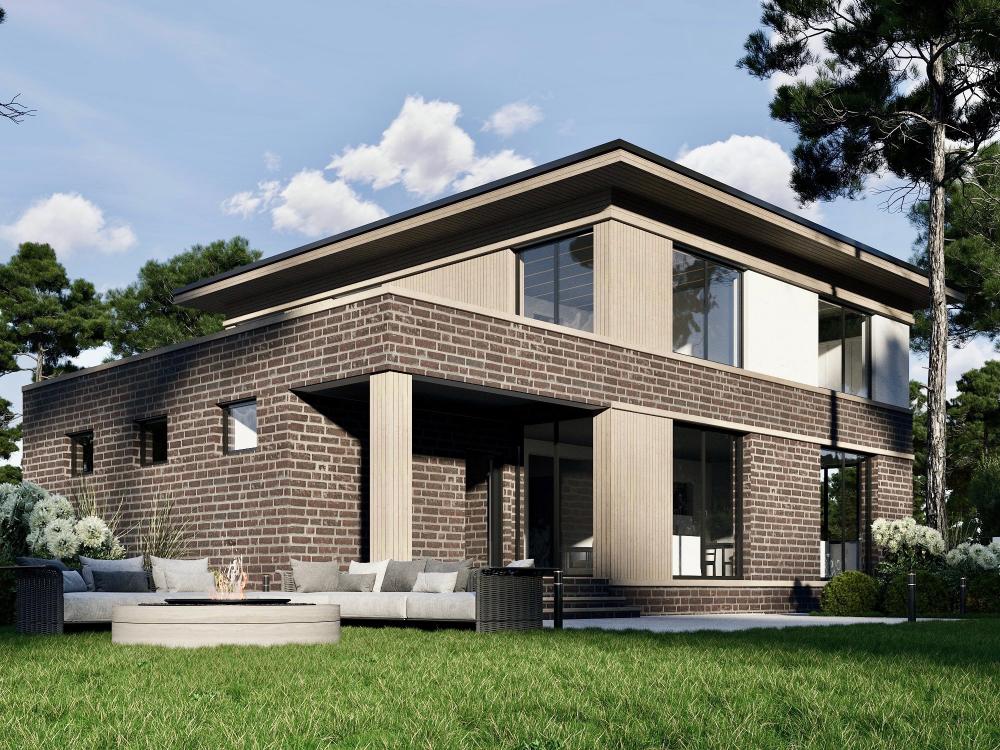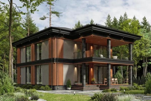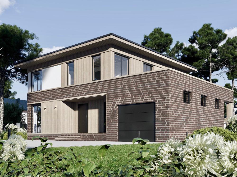 Солидный дом с гаражом для комфортной жизни большой семьи из 4-8 человек. Здесь всё дышит удобством и достатком. В просторной гостиной с камином много места для отдыха, семейных обедов. Рядом кухня с кладовой. Из холла двери ведут в спальню, санузел и в гараж, оттуда в котельную и на террасу. На втором этаже 3 большие спальни, к одной из них примыкает вместительная гардеробная. Из спален есть выход на террасу над гаражом. Панорамное остекление делает помещения максимально светлыми, а здание стильным и гармоничным.