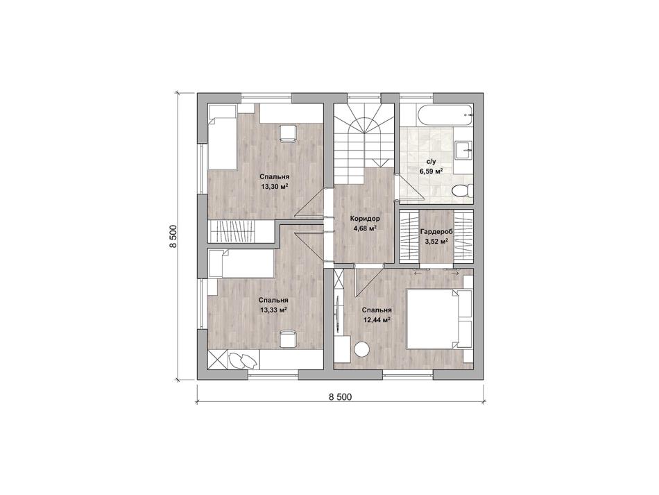 - Габаритные размеры дома 8,5 м х 8,5 м