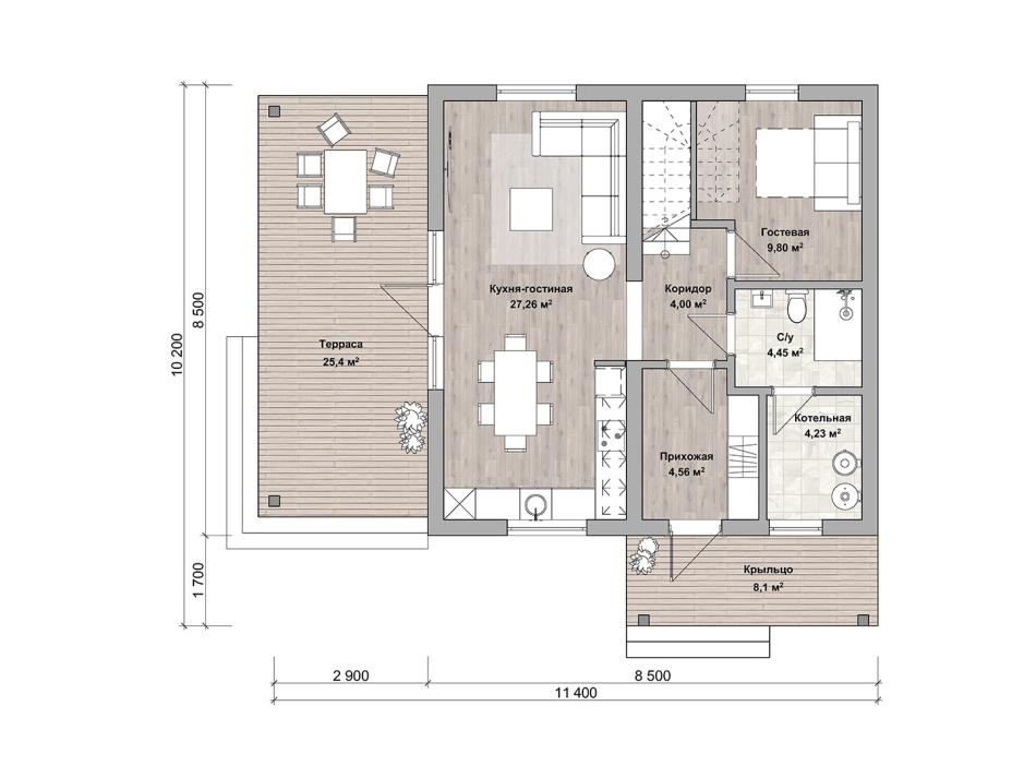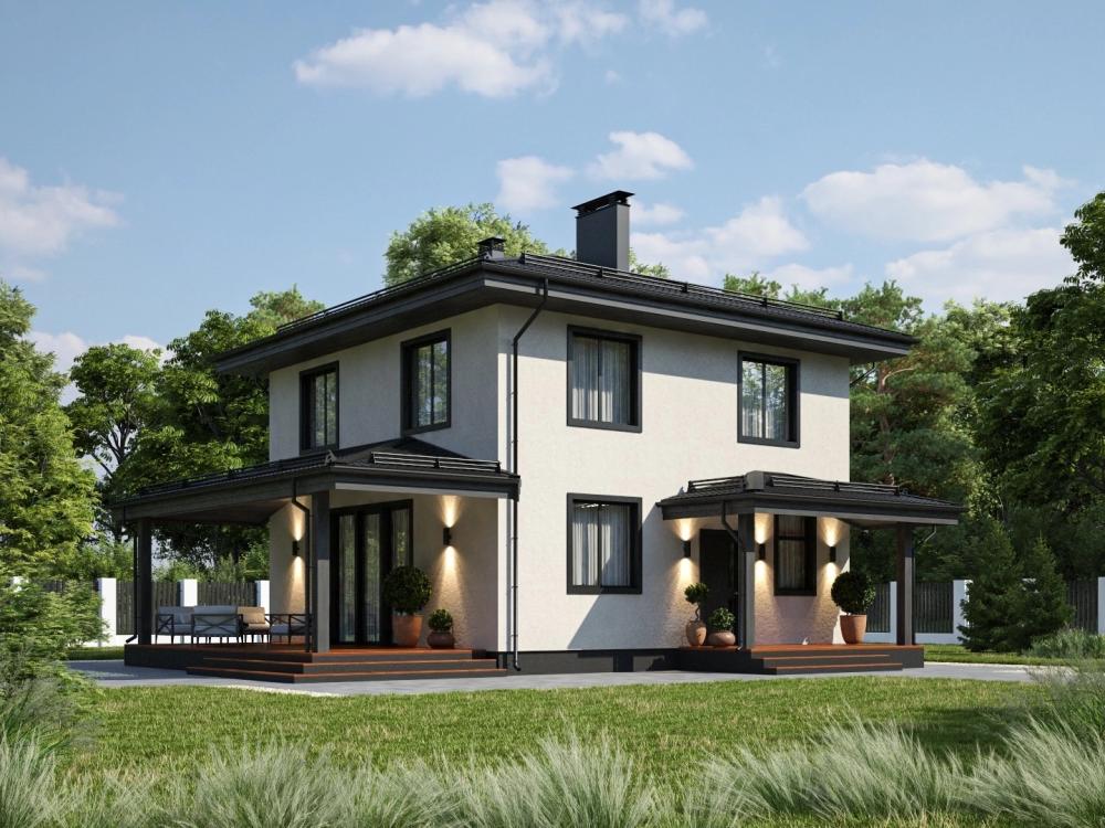 Проект двухэтажного дома для круглогодичного комфортного проживания семьи из 3-6 человек. Впишется в городской и загородный участок. Гостиная с кухонной нишей – самое большое помещение в здании. За счёт освещения с 3 сторон комната кажется больше, а закрытая терраса действительно удваивает пространство. На первом этаже также расположены гостевая, прихожая и санузел с выходом в котельную. Наверху находятся удобная ванная, одна спальня с гардеробной и две с 2 окнами. Окна делают дом изящнее снаружи и светлее изнутри.