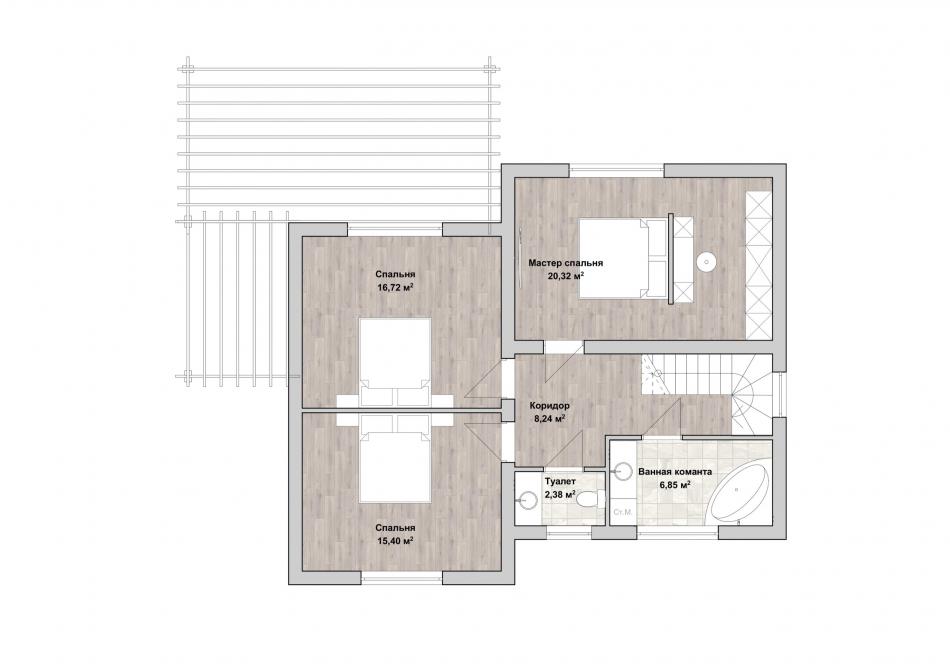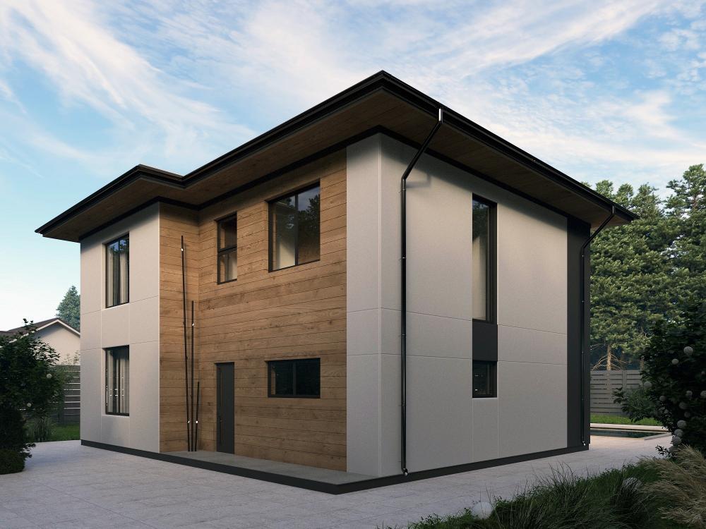 Проект двухэтажного дома для ценителей комфортной, размеренной жизни. Подойдёт как для городского, так и для загородного участка. Первый этаж располагает квадратной гостиной и столовой с кухней. Комнаты освещаются панорамными окнами, сообщаются между собой, есть выход на террасу. У входа в дом находятся гостевая спальня, санузел с душевой. Пространство под лестницей использовано под котельную. Три просторные спальни занимают второй этаж. Туалет, роскошная ванная комната и лестница наверх оборудованы окнами. Отделка и форма здания с улицы сдержанная и строгая. Со стороны двора панорамные окна делают дом похожим на виллу, говорят о статусе и стиле хозяев. .