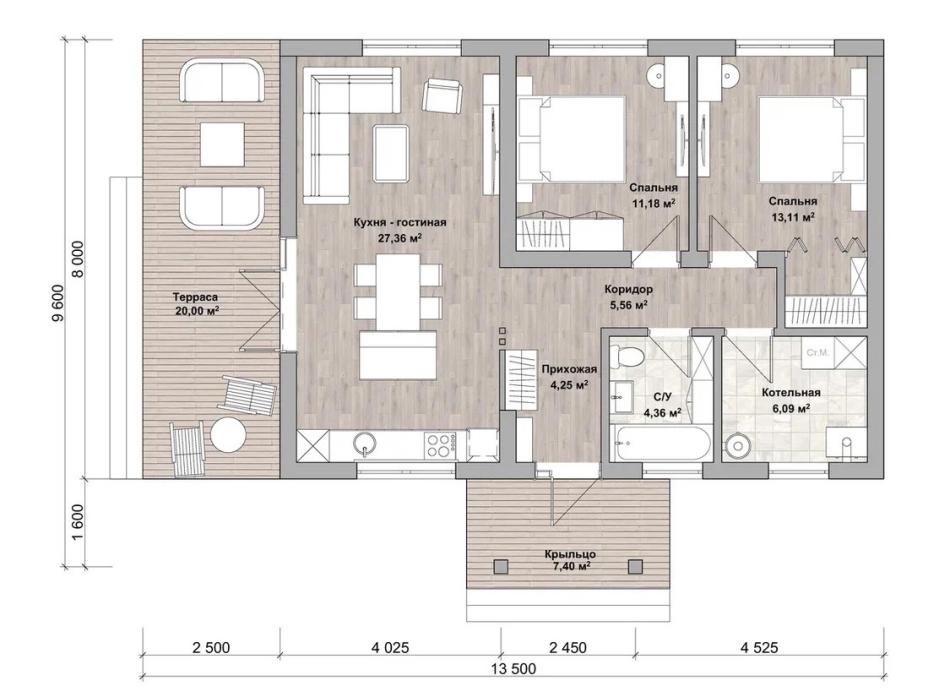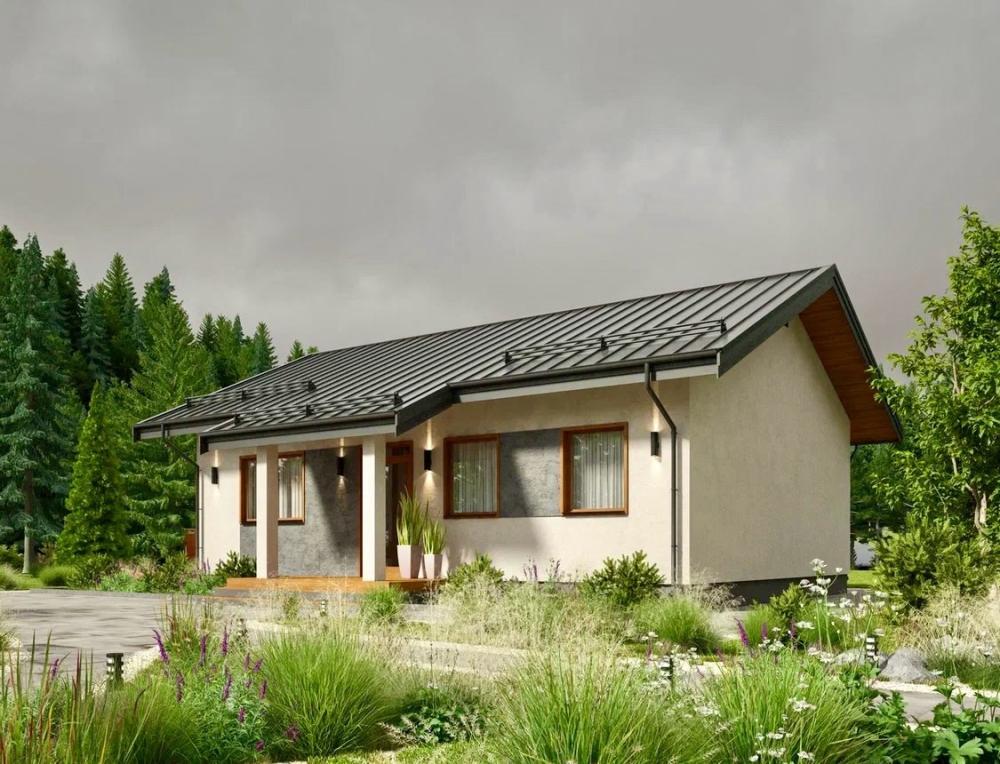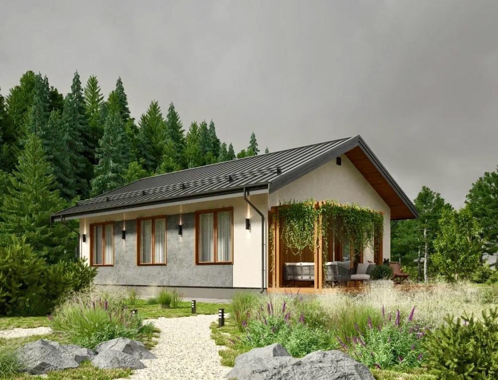 Проект небольшого одноэтажного дома для семьи из 2-4 человек. Бюджетный эргономичный дом впишется в любой участок и пейзаж. Станет любимым семейным гнездом или дачным домиком. Крыльцо с навесом и прихожая на страже микроклимата. Прямоугольная светлая кухня-гостиная почти удваивается с выходом на террасу. 2 спальни отделены от общего пространства толстыми стенами. Ванная комната и котельная обеспечат комфорт и уют. Проект подойдёт молодой семье, пенсионерам, любителям жизни в максимальной близости с природой.