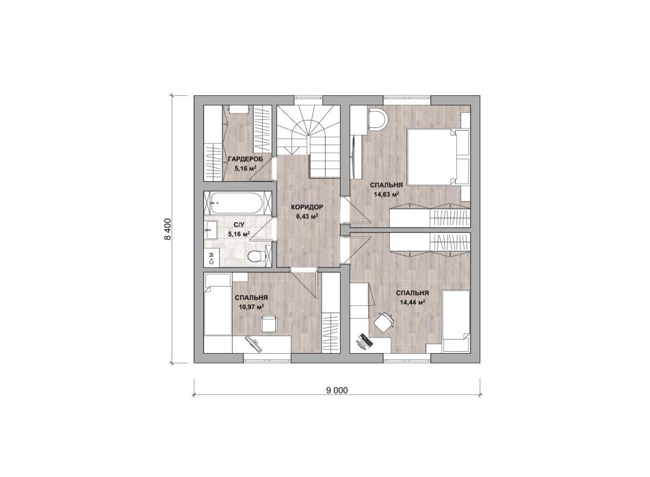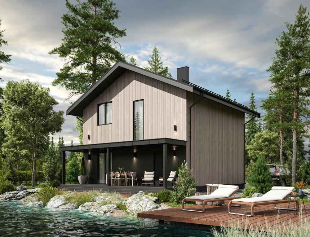 - Двухэтажный дом с сауной – новый уровень комфорта. Совмещает в себе привычную планировку и домашнюю “душегрейку”. Большую часть первого этажа занимает кухня-гостиная с выходом на крытую террасу. Туда же ведёт вторая дверь из сауны, примыкающей к ванной. Наверху типичная планировка: 3 спальни, ванная и гардеробная. Дом подойдёт для семьи из 3-5 человек. Идеально для строения на берегу реки или озера.