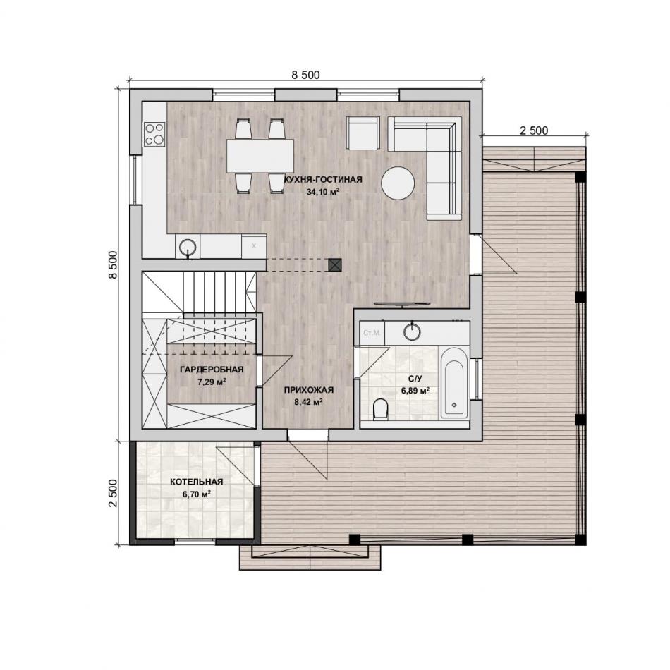 - Габаритные размеры дома 8,5 м х 8,5 м