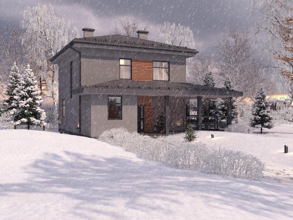 Проект двухэтажного дома для семьи из 3-5 человек. Легко впишется в небольшой городской участок. Угловая терраса закрывает вход в дом от осадков. Котельная обеспечивает комфортный микроклимат в помещении, гардеробная – порядок с порога. Ванная с естественным источником света. Просторная гостиная совмещена со столовой и кухней. Комната освещается тремя большими окнами, есть выход на террасу через стеклянную дверь. Лестница с высоким окном ведёт наверх. Второй этаж – приватная зона. Три спальни и ванная – всё, что нужно для восстановления сил, отдыха. Идеально для молодой семьи с подрастающими детьми.