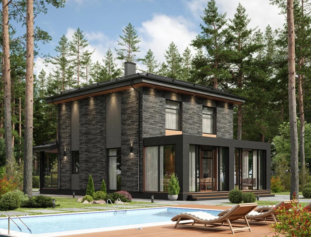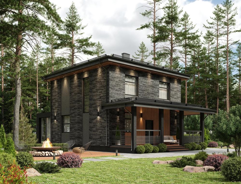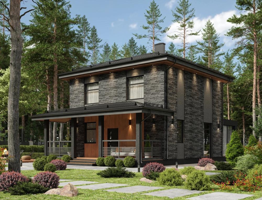 Проект двухэтажного здания с 2 террасами – отличный вариант увеличить площадь дома без особых затрат. Подходит для круглогодичного проживания семьи из 3-5 человек. Большое крытое крыльцо защищает входную дверь от осадков. Служит дополнительной зоной отдыха. Гостиная совмещена с кухней в нише и столовой. Застеклённая терраса – светлое многофункциональное помещение с раздвижными окнами. Предусмотрены 3 спальни, 2 ванные комнаты, гардеробная.