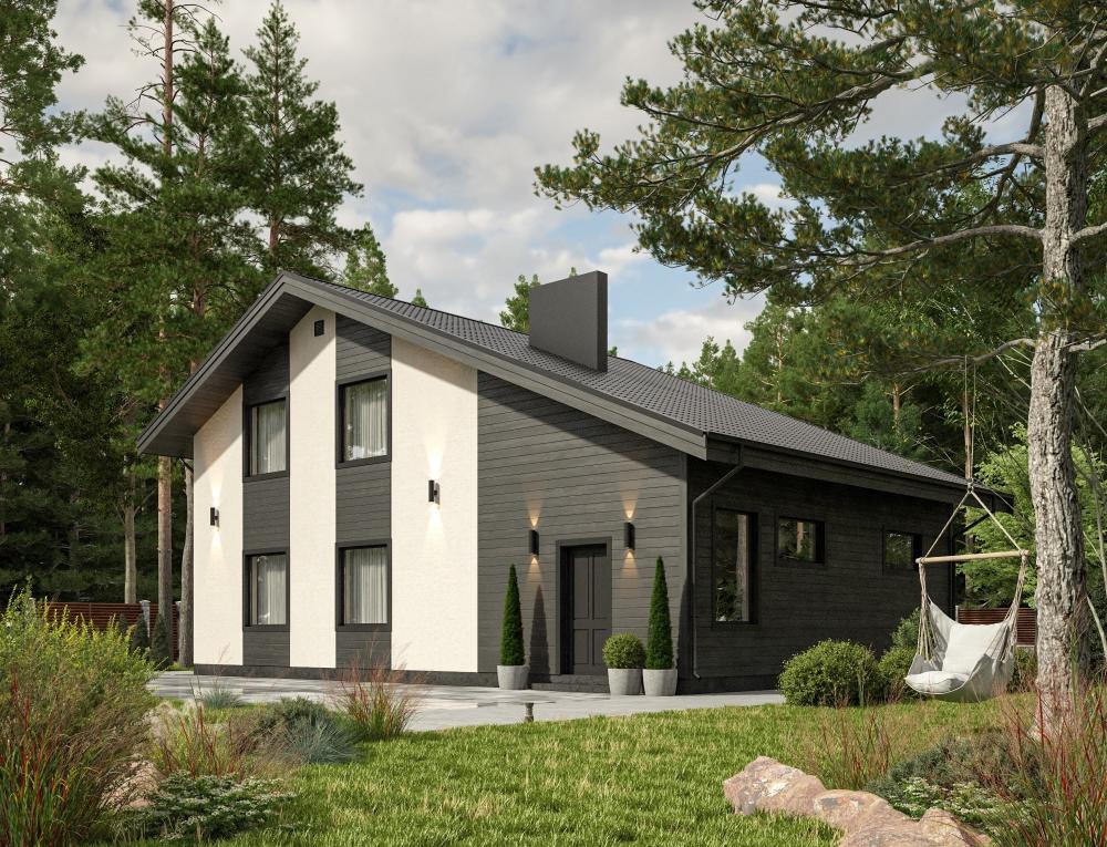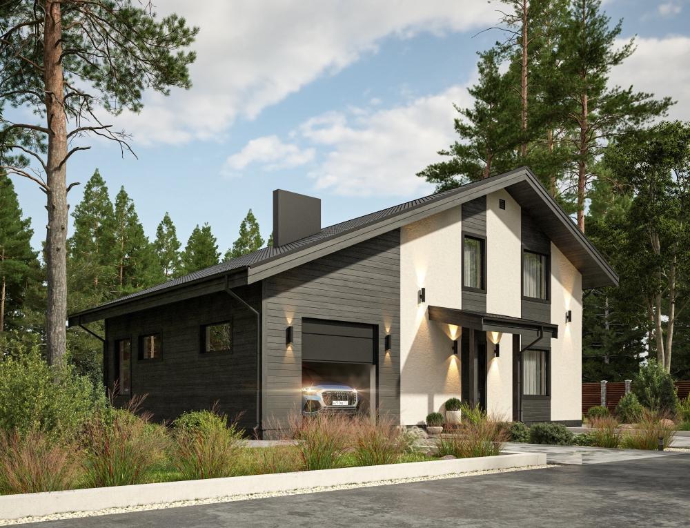Проект дома с гаражом. Удобный и эргономичный, рассчитан на постоянное проживание семьи из 4-6 человек. Комбинированная отделка стройнит здание. Часть пристройки под гараж занимает котельная, поэтому удалось сделать отдельную кухню-столовую. Гостиная служит местом сбора домочадцев и приёма гостей. В доме 4 спальни, 2 ванные комнаты и гардеробная. Много места, света и воздуха. Интересный проект при использовании стандартных приёмов проектирования.