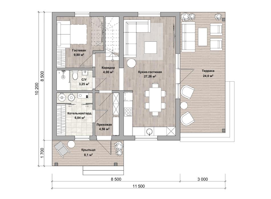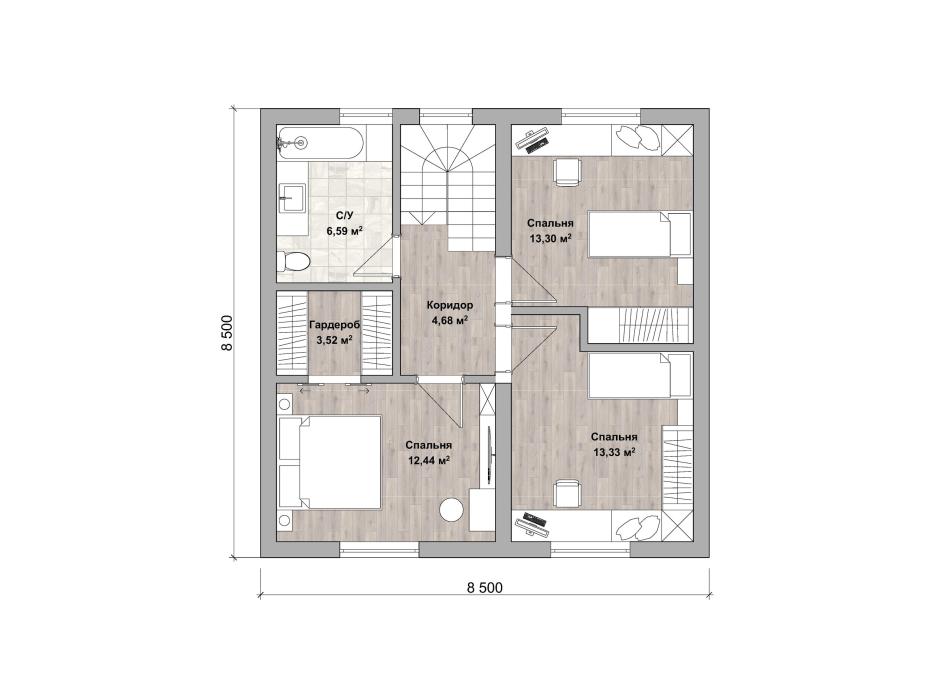 - Габаритные размеры дома 8,5 м х 8,5 м