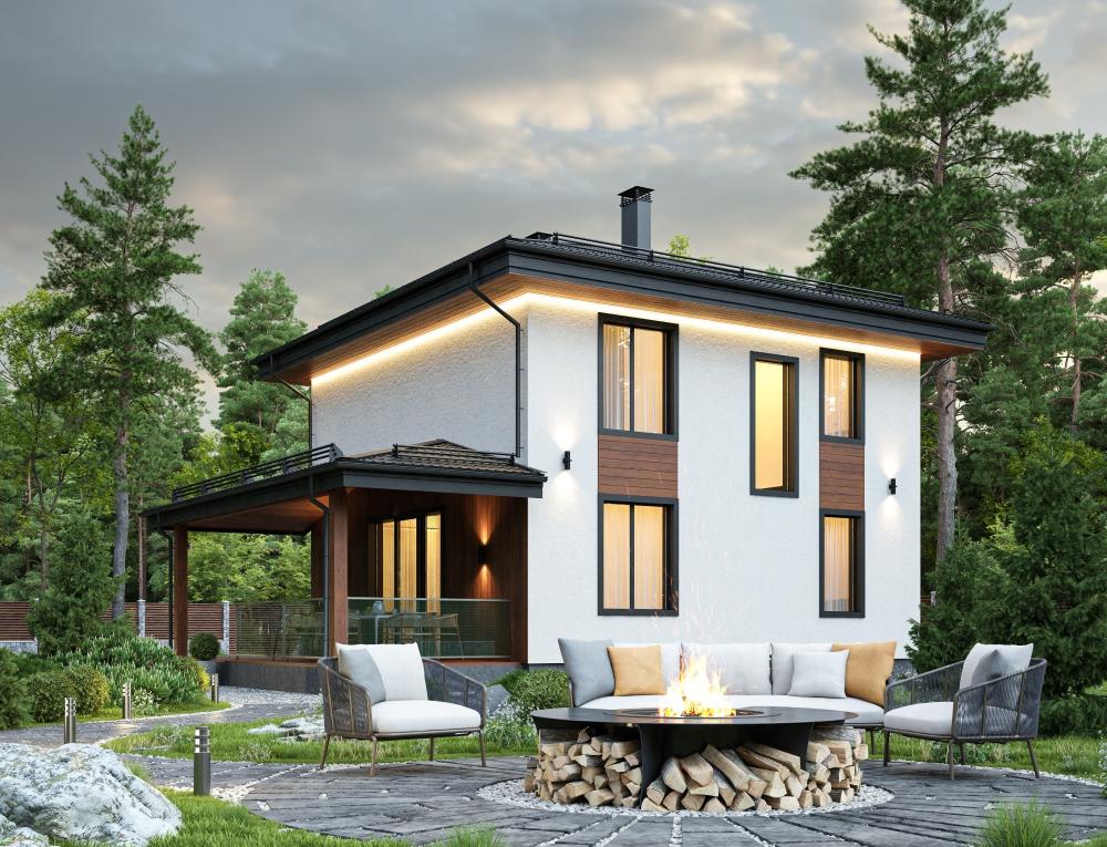 Проект двухэтажного дома. Оптимальный размер для семьи из 4-5 человек. Подходит к круглогодичному проживанию благодаря тёплой прихожей, котельной. Впишется в городской и загородный участок благодаря классической внешней отделке, эффектной подсветке. Половину первого этажа занимает светлая гостиная с кухонной зоной, огромным панорамным окном и выходом на просторную крытую террасу. С другой стороны расположены котельная-гардеробная, санузел и гостевая спальня. На втором этаже 3 спальни, гардеробная и ванная комната.