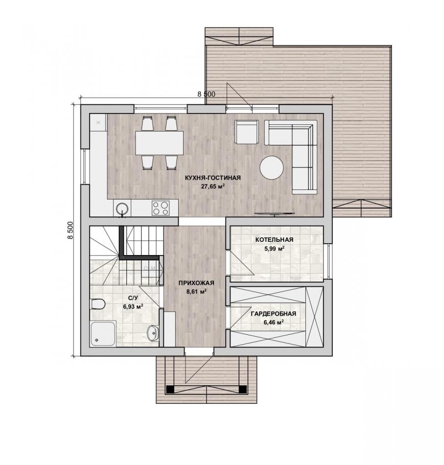 - Габаритные размеры дома 8,5 м х 8,5 м