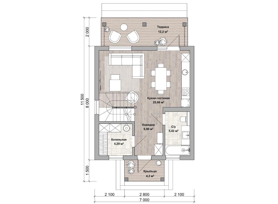 - Габаритные размеры дома 8 м х 7 м