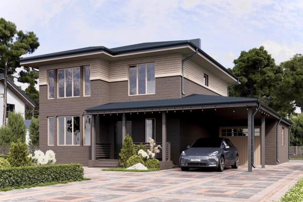 Проект компактного двухэтажного дома для семьи из 3-4 человек. Достаточно бюджетный, с полным набором удобств. Благодаря размерам поместится на любом участке, выглядит достойно. На первом этаже прямоугольная гостиная. Комната зонирована для отдыха, приготовления еды, совместной трапезы. Выход на крытую террасу и панорамные окна визуально увеличивают площадь помещения. Рядом ванная комната и котельная, где много места для хранения. На втором этаже 3 спальни. В доме ничего лишнего, зато есть всё нужное для комфортной жизни небольшой семьи. За счёт отделки и подсветки здание смотрится современно и солидно.