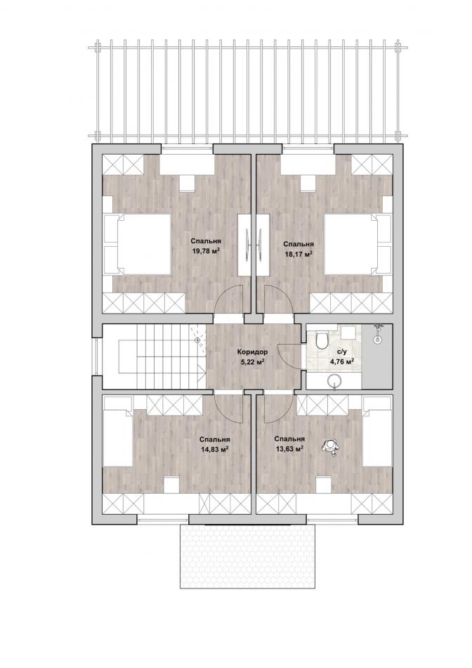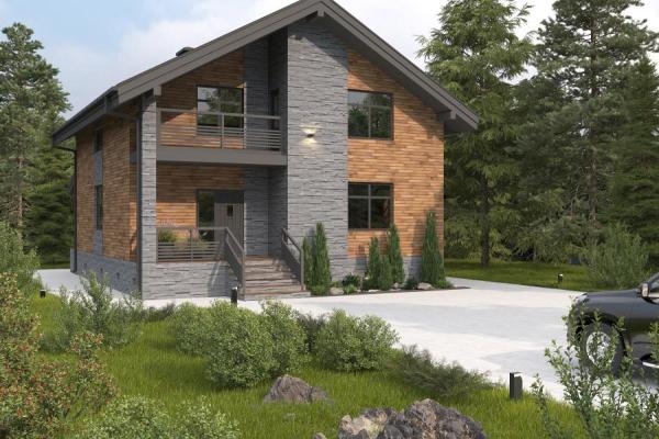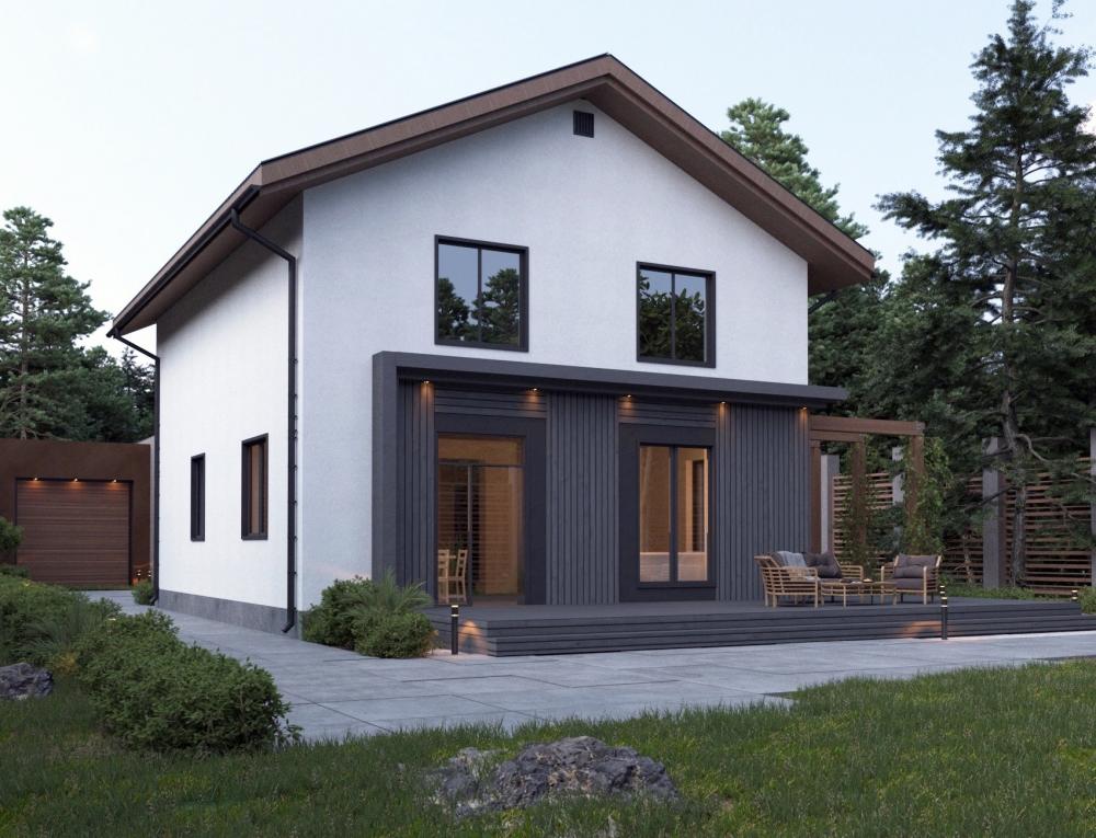 Удобный, бюджетный, двухэтажный дом с 5 спальнями для большой семьи. 5-8 человек разместятся в нём со всеми удобствами. Здесь всё просто, функционально и уютно одновременно. В отделке фасада штукатурка и лиственница отлично дополняют друг друга. Котельная, ванная расположены у входа. Двери в гостевую спальню под лестницей наверх. Гостиная совмещена с кухней и столовой. Окна в пол и стеклянные двери наполняют комнату светом, визуально увеличивают. Открытая терраса и консоли с подвесными креслами дополняют общее пространство. Второй этаж наполнен 4 просторными спальнями и ванной с душевой кабиной. Идеальный проект дома для круглогодичного проживания большой и дружной семьи.