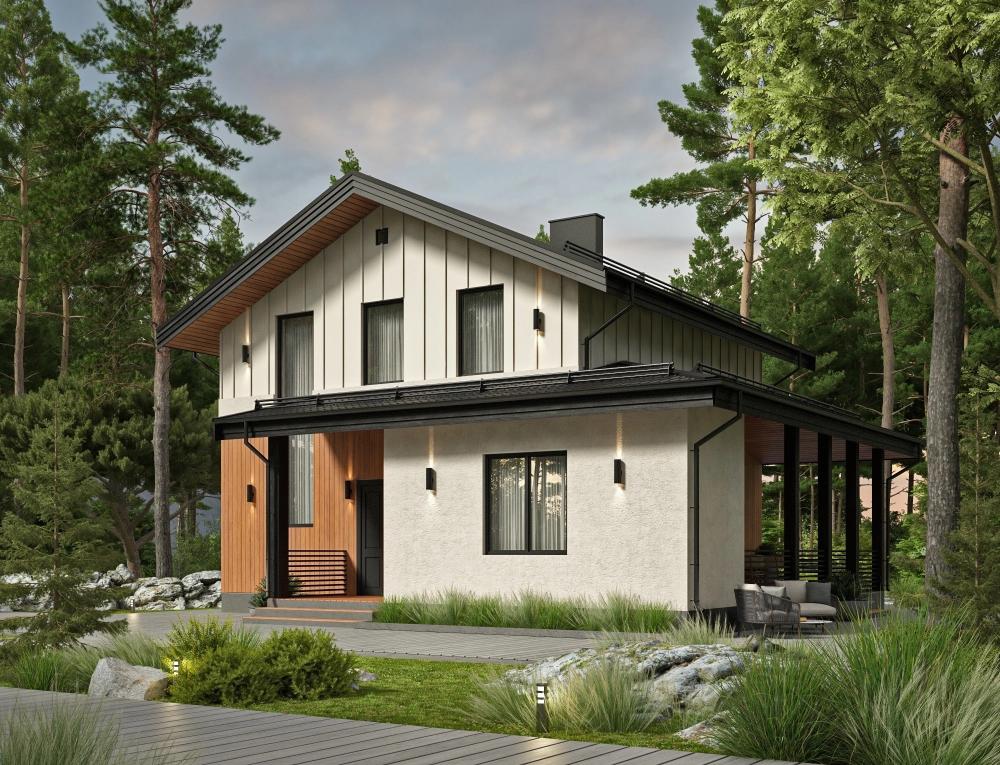 Проект небольшого двухэтажного дома с крытой террасой – мечта гостеприимной семьи из 3-5 человек. Уютная гостиная совмещена с кухней. Из комнаты двери ведут в спальню с гардеробной и на террасу. Терраса заканчивается хозяйственным помещением с котельной и стеллажами. Второй этаж начинается со светлого холла. Оттуда двери ведут в 2 просторные спальни, в каждая своя гардеробная. На обоих этажах свои ванные комнаты. Дом довольно компактный, подойдёт как для городского участка, так и для загородного.