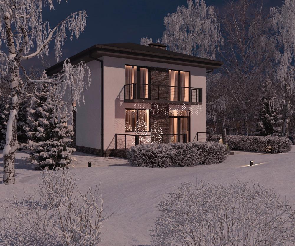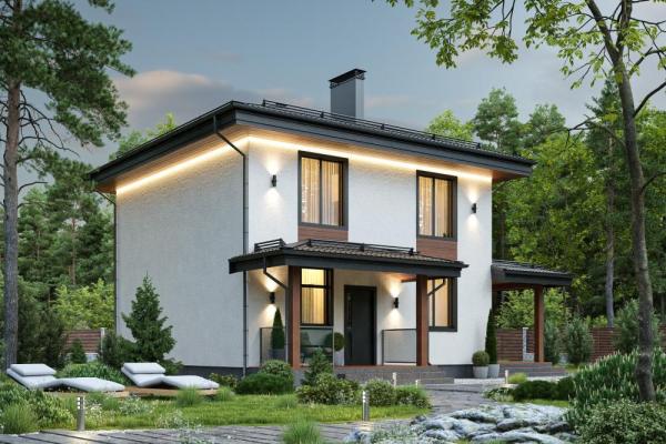 Проект небольшого, уютного, бюджетного дома для семьи из 4-6 человек. Терраса и балкон со стеклянным ограждением, крыльцо с колоннами делают его традиционным и лёгким одновременно. Гостиная визуально разделена на две части: зону отдыха с камином и столовую с кухней. Терраса вдвое увеличит площадь комнаты в тёплое время года. Из просторного холла двери ведут в гостевую и ванную. По лестнице вы подниметесь наверх, к трём хозяйским спальням. К одной из них примыкает гардеробная, из другой есть выход на балкон. Небольшой санузел здесь уместен. Обратите внимание на панорамное остекление комнат. Абсолютно все помещения в доме с источником естественного освещения, даже лестница и котельная.