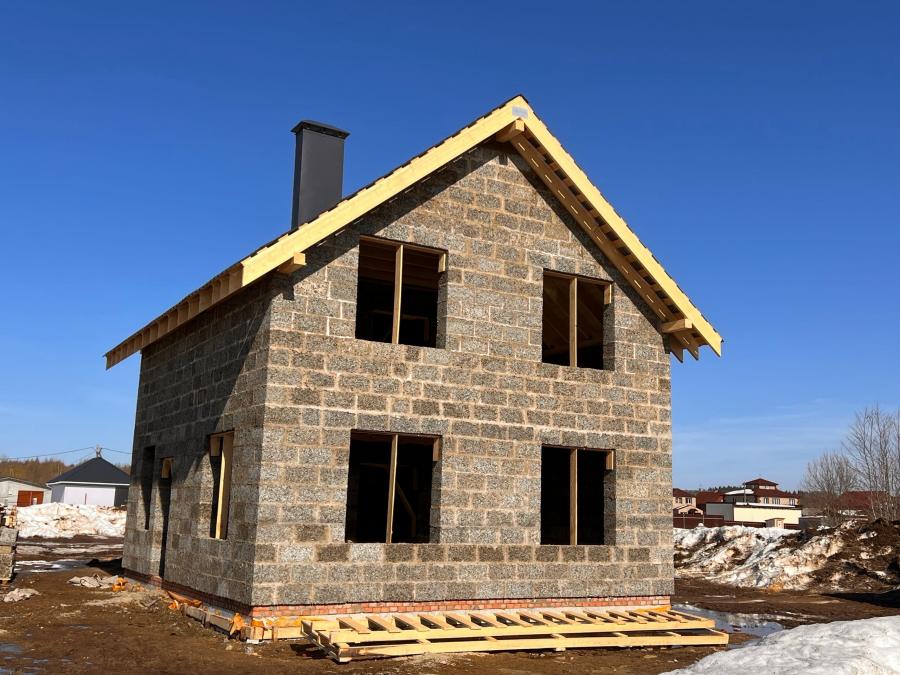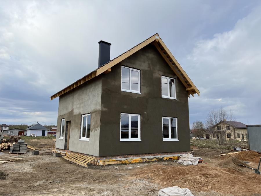 Сегодня мы поговорим о строительстве дома в Ильинском. Площадь этого дома 116 м2, в конце марта возвели коробку. Совсем не давно установили окна и завершили черновую штукатурку стен.