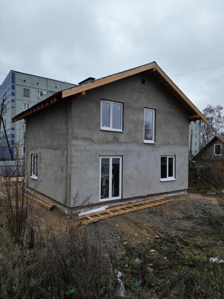 Конструктив готов, уже оштукатурен. Окна и двери на местах. Прям, чувствуем, как из соседних домов смотрят жители и подумывают о таком домике для себя.