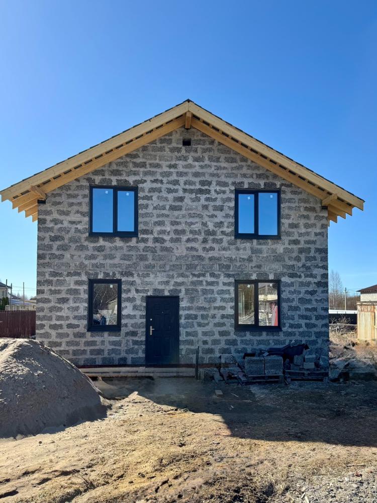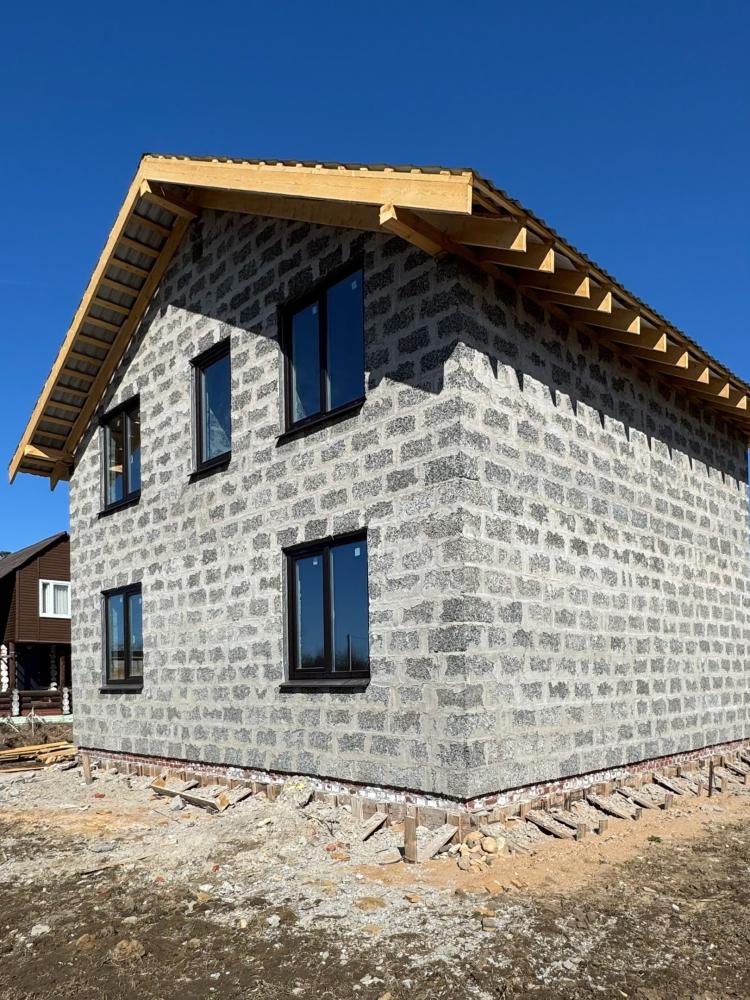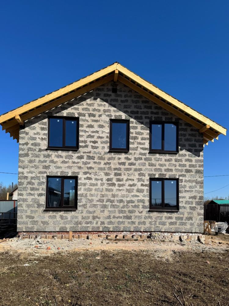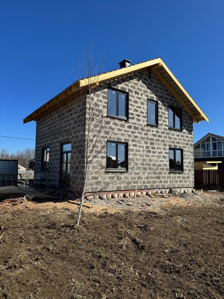 Как это вы на небо не смотрели? Ах, сразу на дом обратили внимание. Так это правильно. Посмотреть есть на что. Свеженький конструктив с пылу с жару. Уже и крыша оформлена в лучшем виде, и двери с окнами на местах.