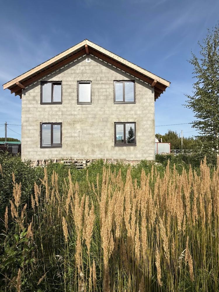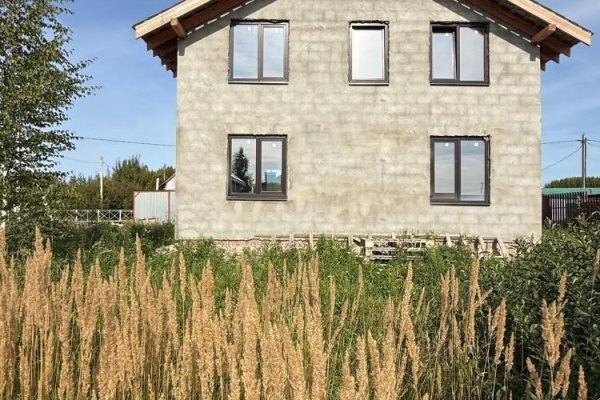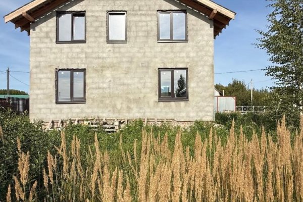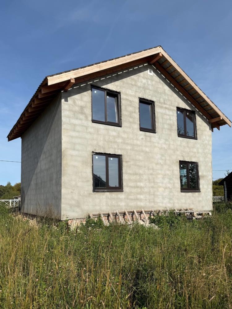 Вот на фото новенький дом. Построен он рядом с Вологдой. Здание большое, уже оштукатурены стены, на местах окна и кровля. Дом полностью закрыт по всему периметру от непогоды, готов к следующим этапам отделки.