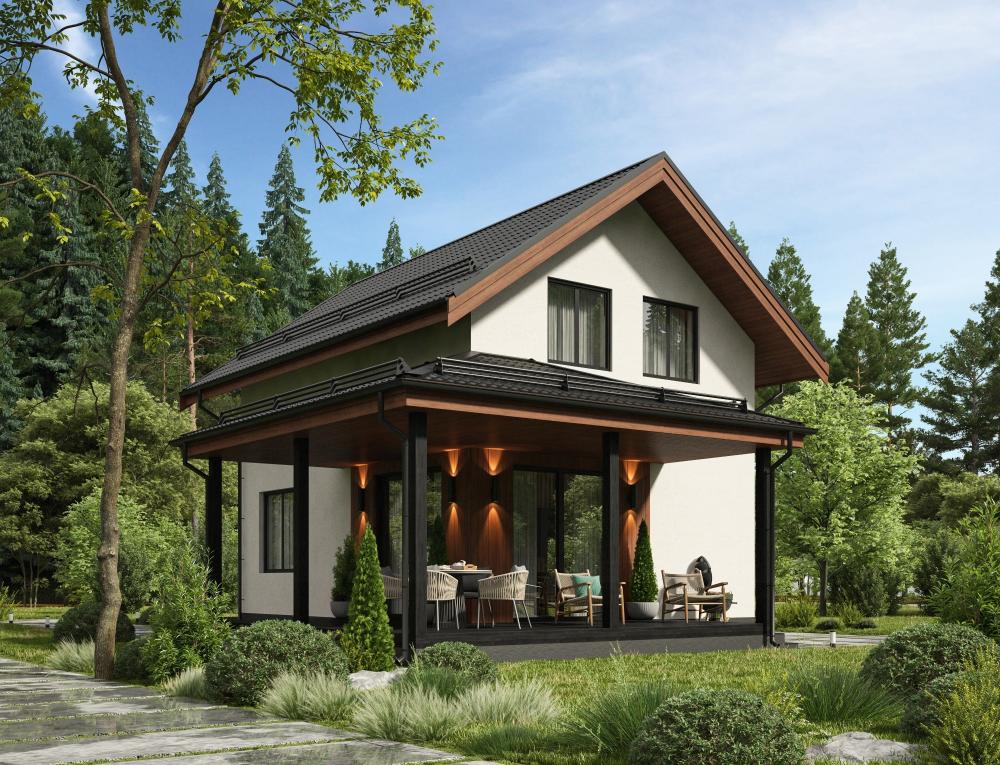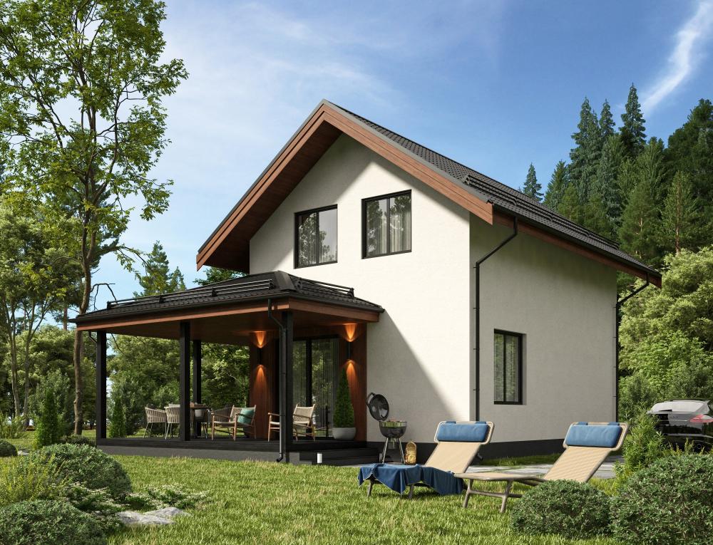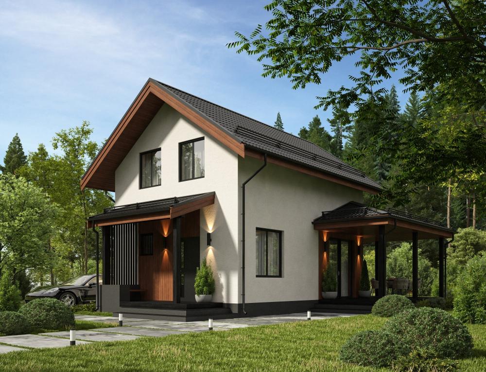 Проект небольшого домика со всеми удобствами для молодой семьи. Занимает так мало места, что впишется в любой городской или дачный участок. Рассчитан на круглогодичное проживание 3-4 человек. На первом этаже миниатюрная кухня-гостиная с выходом на просторную угловую закрытую террасу. На верхнем этаже расположились 3 спальни. В доме предусмотрены ванная внизу и туалет на втором этаже, есть котельная.