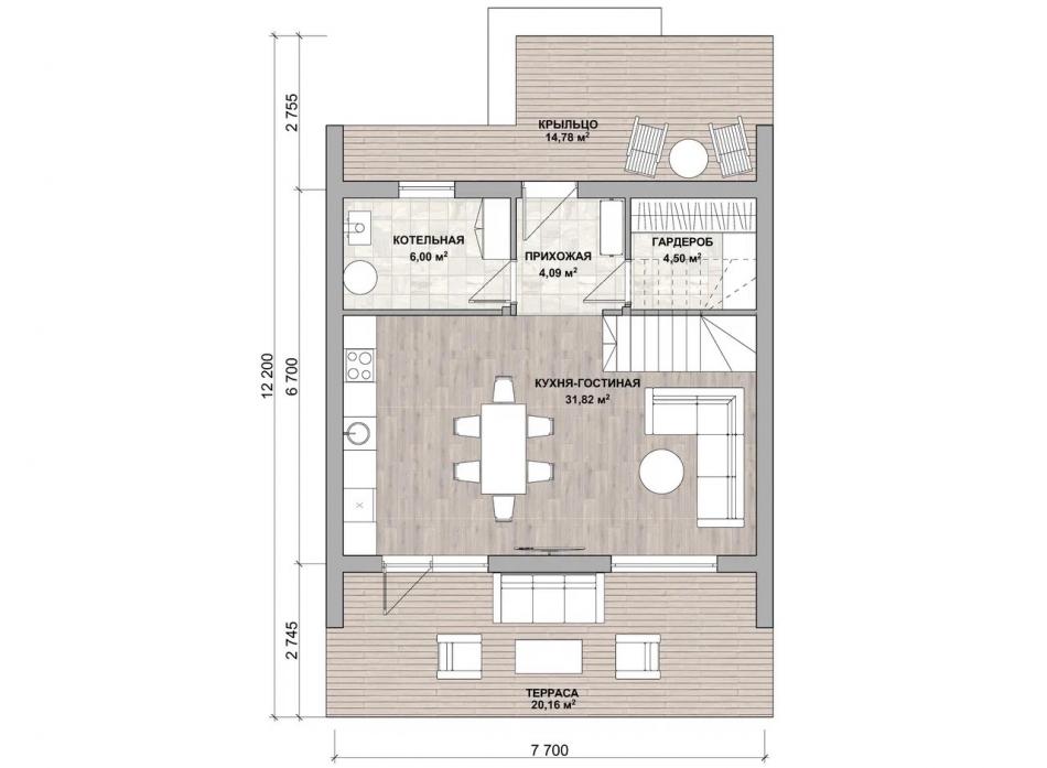 - Габаритные размеры дома 7,7 м х 6,7 м