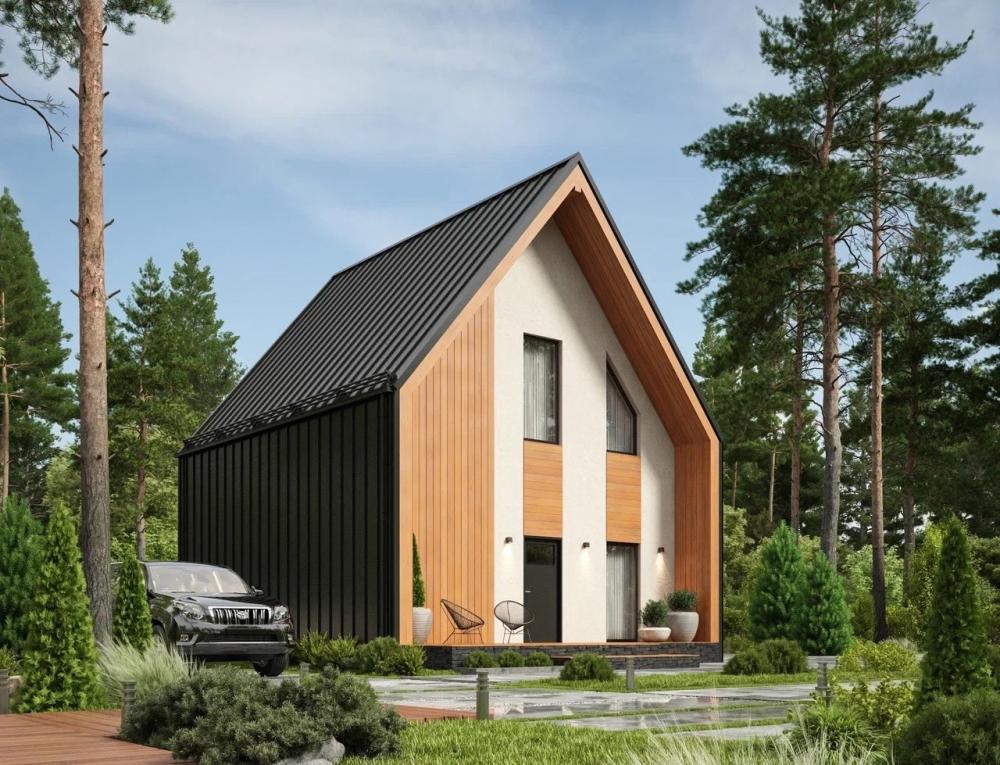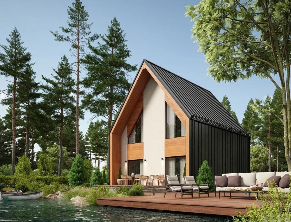 Проект дома в стиле барнхаус. Отличный вариант для молодой семьи из 2-4 человек, для любителей лаконичных решений. Подойдёт для дачного, небольшого городского участка, пригоден для круглогодичного проживания. На первом этаже просторная кухня-гостиная с панорамным остеклением и выходом на террасу, котельная и гардеробная. Наверху расположены 2 спальни, большая ванная и вторая гардеробная. Окна второго этажа повторяют линию крыши, улучшают освещение помещений, украшают фасады.