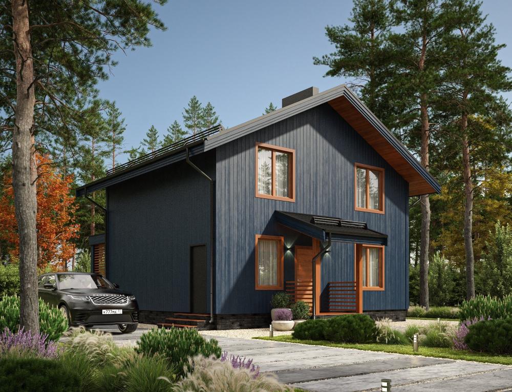 Проект двухэтажного дома для семьи из 4-6 человек. Рассчитан на круглогодичное проживание. Небольшое здание с классической планировкой. Большую часть первого этажа занимает гостиная-кухня с выходом на крытую террасу. Здесь же гостевая спальня, ванная и котельная с запасным выходом. На втором этаже разместились 3 спальни, гардеробная и вторая ванная. Всё чётко, эргономично, но с полным набором удобств для любимой семьи.