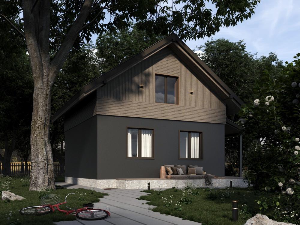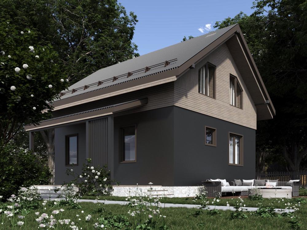 Проект небольшого бюджетного дома с мансардой. Здание хорошо впишется в любой участок земли благодаря своей компактности. Навес и тамбур необходимы, чтобы в доме сохранялись тепло и уют. Гостиная встречает своей парадной частью, от входа не сразу заметна кухня, утопленная в нишу. Свет в помещение попадает через 3 окна с двух сторон, что делает его визуально больше. Лестница наверх органично вписана в пространство и почти не занимает места. Справа от входа находятся котельная, ванная и гостевая спальня. В мансарде разместились 3 жилые комнаты, гардеробная и санузел. Дом подойдем семье из 4-6 человек для постоянного проживания или в качестве дачи.