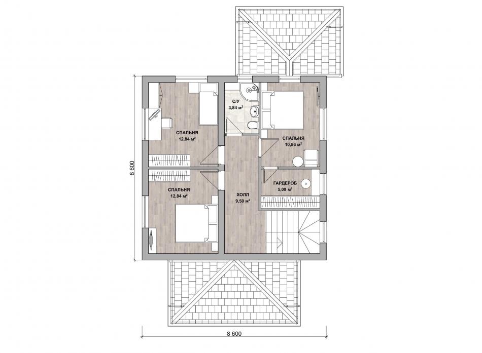 - Габаритные размеры дома 8,6 м х 8,6 м