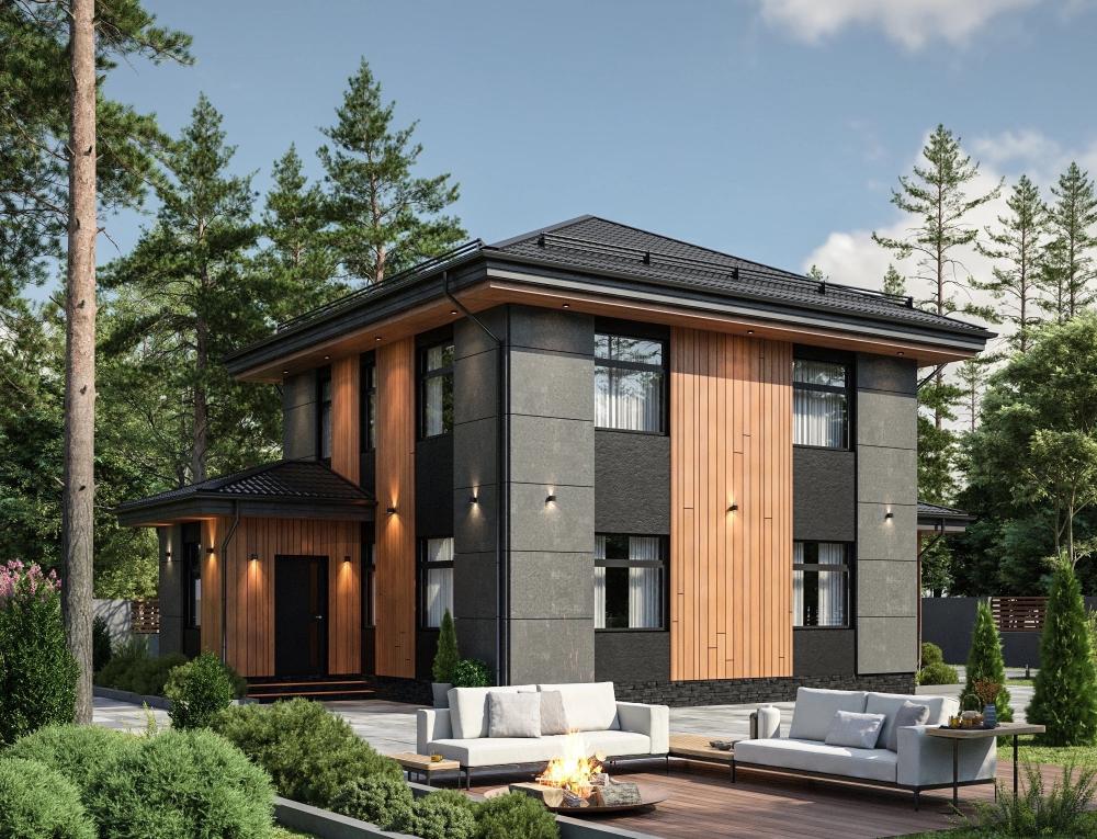 Подойдёт для круглогодичного проживания семьи из 4-6 человек. Проект двухэтажного дома, где тамбур и котельная не отнимают ни метра жилой площади. Во внешней отделке предусмотрена эффектная подсветка. Гостиная совмещена с кухней, но в зонах отдыха и приготовления пищи свои входы. На первом этаже расположены кабинет, санузел и хозяйственное помещение с выходом в котельную и во двор. Лестница с высоким окном ведёт на второй этаж. Там находятся 3 спальни, одна из которых с большой гардеробной. Второй санузел около спален – забота о домашних.