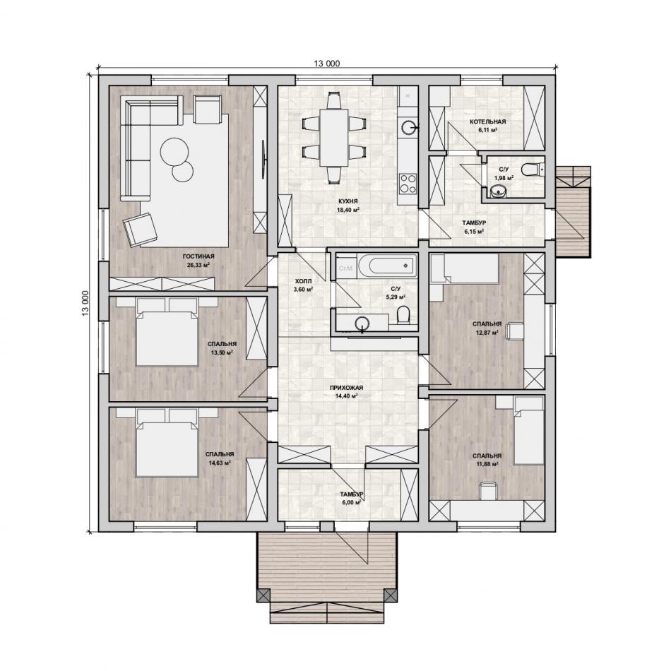 - Габаритные размеры дома 13 м х 13 м