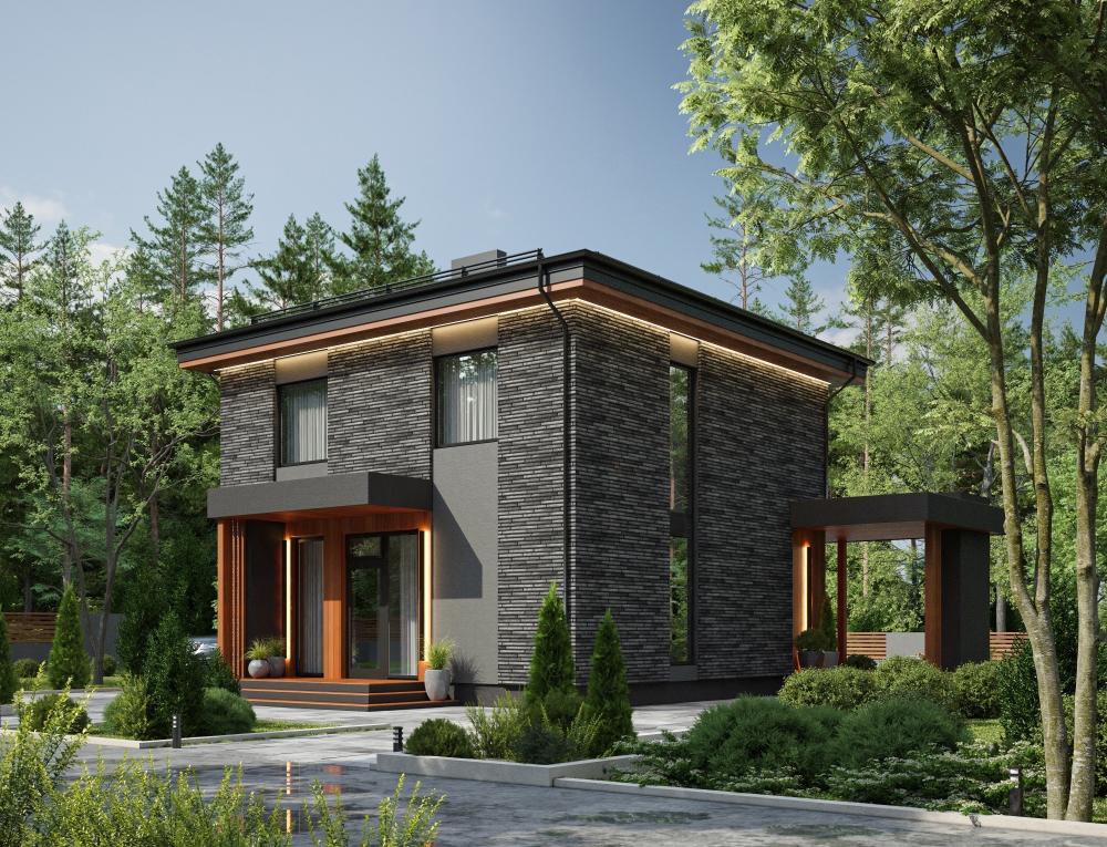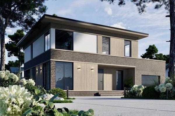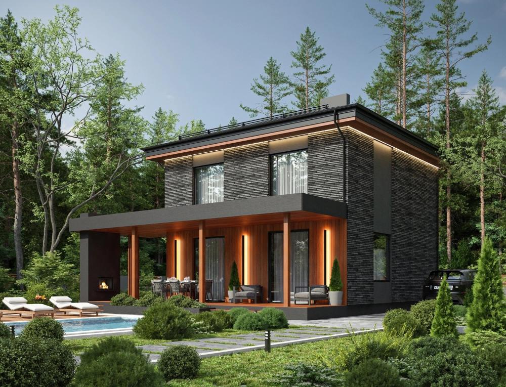 Проект совмещает в себе самые заветные желания заказчиков. При своих скромных размерах он производит солидное впечатление на окружающих. Подойдёт гостеприимной семье из 4-5 человек. Почти весь первый этаж занимает гостиная. На 50 м² расположится мягкая мебель, домашний кинотеатр, ещё останется место для танцев. Здесь же устроена кухня и столовая зона. Панорамные окна наполняют комнату светом и воздухом, делают визуально ещё больше. К гостиной примыкает просторная крытая терраса. На втором этаже всё для полноценного отдыха: 3 спальни и вторая ванная.