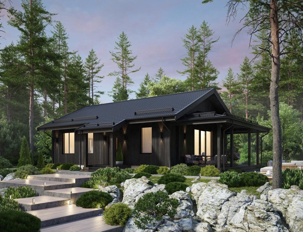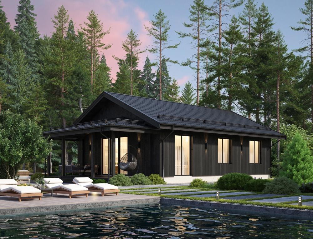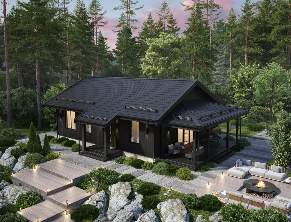 Проект для тех, кто решил построить одноэтажный дом. Подойдёт для постоянного проживания семьи из 4-5 человек. Годится в качестве дачного варианта тем, кому важен комфорт везде. Предусмотрены 3 спальни, 2 санузла, котельная, прихожая. Гостиная совмещена с кухней, украшена панорамными окнами. Здесь можно выйти на террасу под навесом, провести на свежем воздухе незабываемые часы.