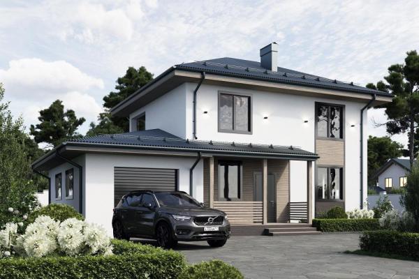Бюджетный, уютный дом с гаражом и двумя террасами. Подойдёт для постоянного проживания молодой семьи или для дачи. Крытая терраса закрывает вход от осадков. Через небольшую прихожую попадаем в кухню-гостиную с видом на парадный въезд и террасу. Слева от входа котельная, лестница наверх, раздельные санузлы. На втором этаже расположены три небольшие спальни. Одна из них с гардеробной. По желанию эта комната с окном может использоваться как кабинет, игровая, мастерская. За домом спрятана терраса с небольшим навесом и камином – отличное место для досуга.