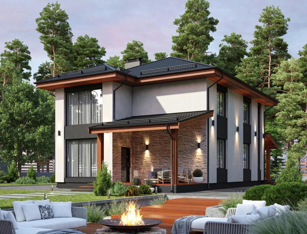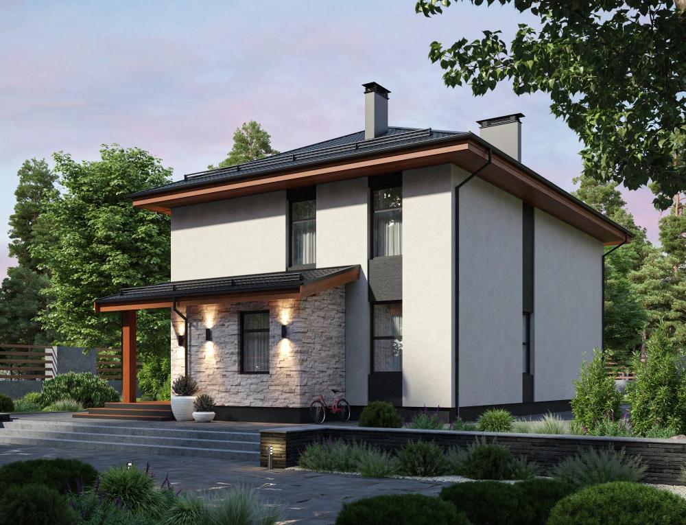 Проект двухэтажного дома. Рассчитан на круглогодичное проживание семьи из 4-6 человек. Фасад с улицы с навесом над входом и выступающим тёплым тамбуром. Сторона, выходящая во двор, оборудована крытой террасой, панорамными окнами. На первом этаже большая гостиная-кухня. Из неё можно пройти на веранду, далее на террасу и в сад. Слева от входа одна из спален. Справа – прачечная, санузел и котельная. Наверху 3 спальни, одна из них с выходом в лоджии, там панорамный вид на окрестности. Рядом просторная ванная комната и гардеробная с окном. Система окон обеспечит освещение холла, лестницы, вид на дорожку к дому. Такой дом будет гармонично смотреться и на городском участке, и на загородном.
